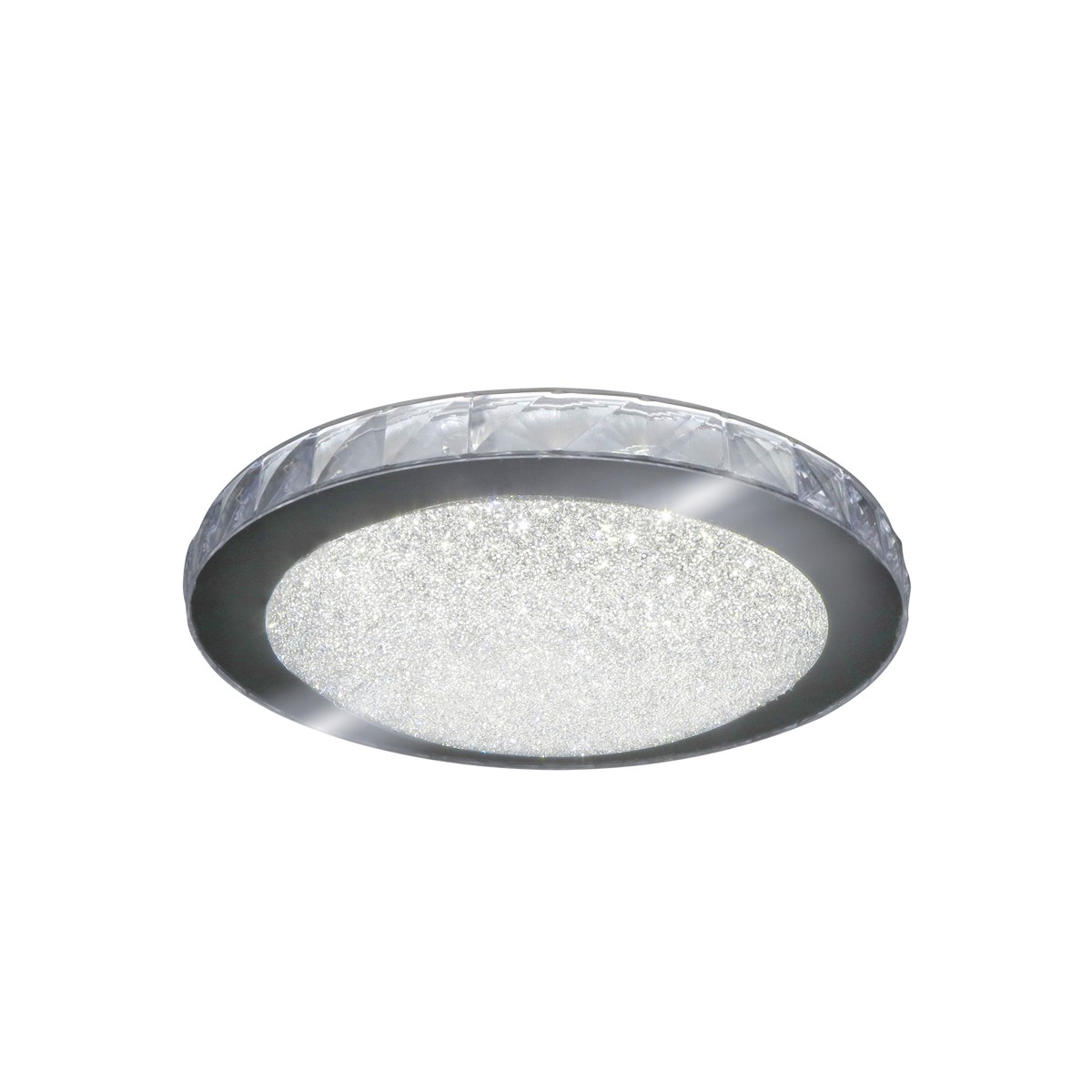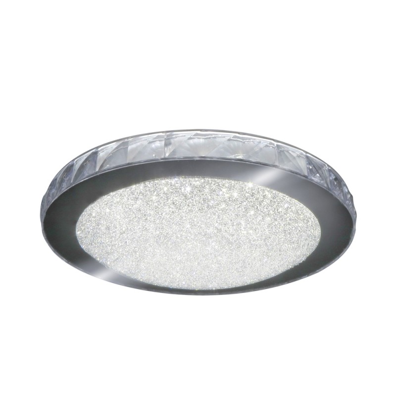 Ceiling lamp with glass effect diffuser. Ceiling lamp with natural white LED lighting (4000K) ideal for providing lighting in bedrooms and living rooms. Nickel metal ring with glass effect pc diffuser around and small crystals at the bottom. It has integrated LED lighting of 35W, 2000 lumens and 4000K. Height 7 cm. and diameter 35 cm.