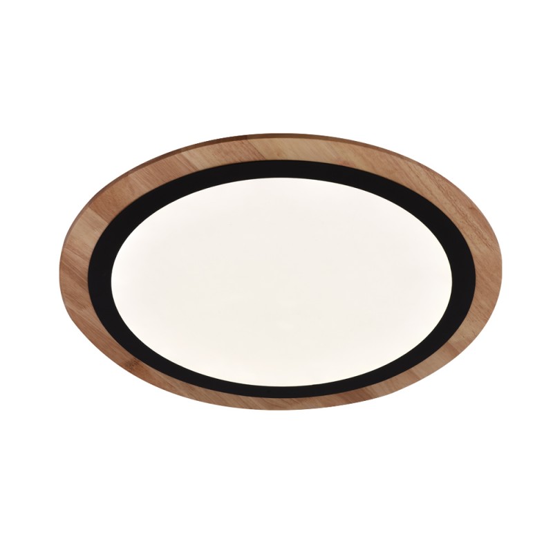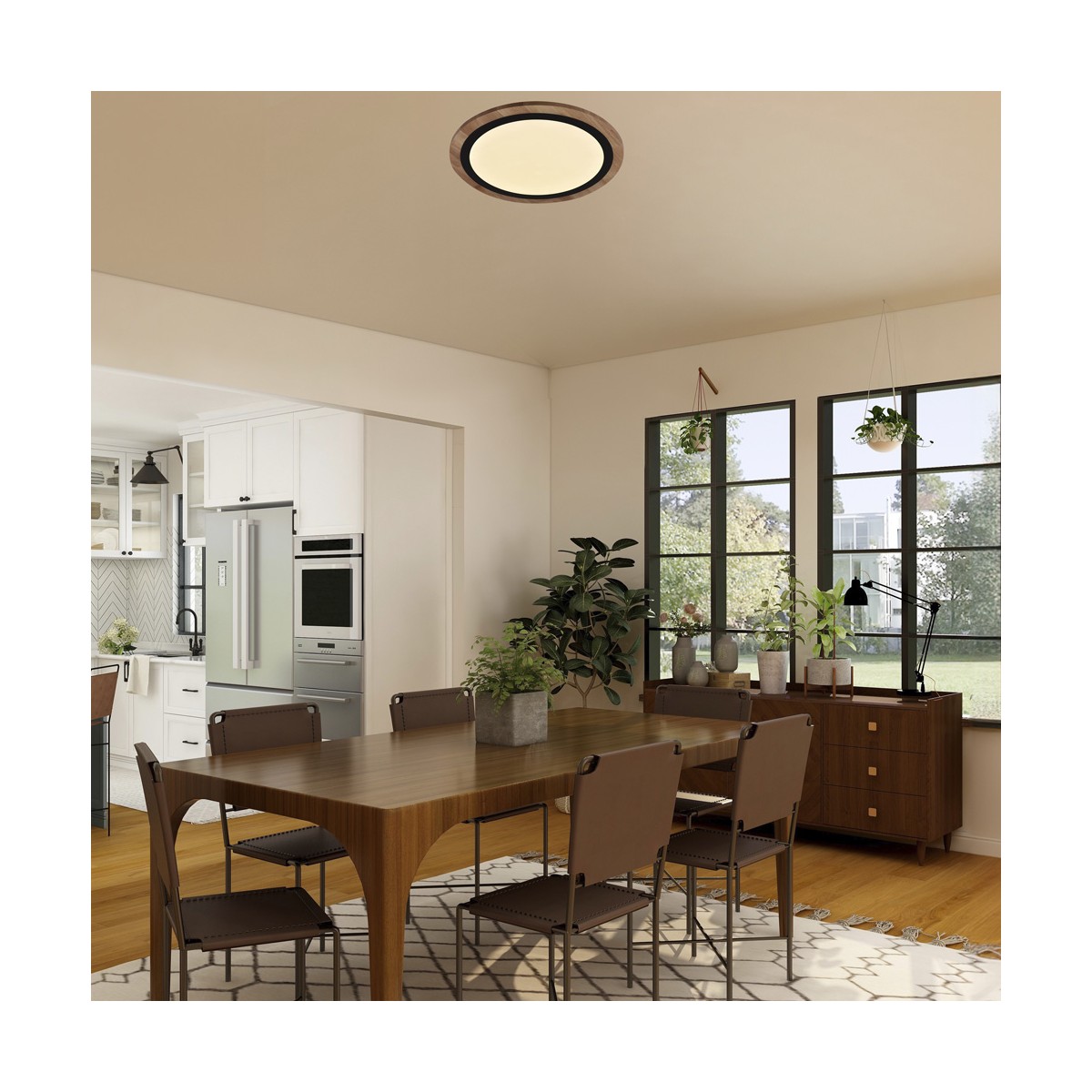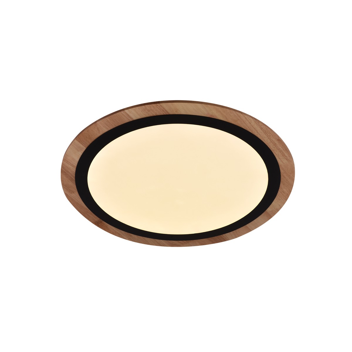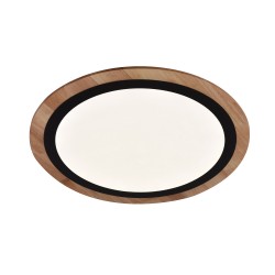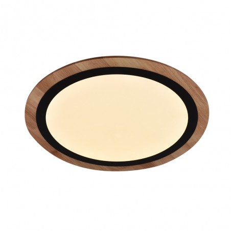 Smart LED ceiling light for living rooms and bedrooms. Circular ceiling lamp with Smart technology and Bluetooth to control the lighting from a smartphone or tablet. Compact circular design in a wood colour and a black inner ring. It has built-in 38W LED lighting with 3350 lumens, adjustable in tone and intensity of light. Includes remote control.