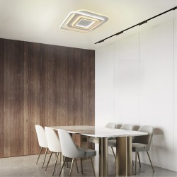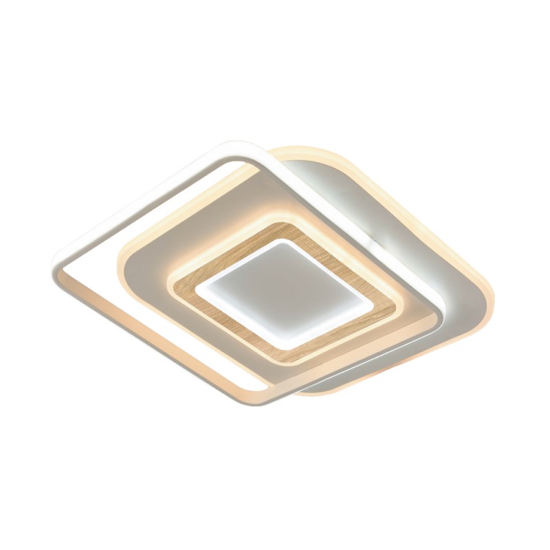 Decorative LED ceiling flush light made up of different superimposed rings creating a geometric design. Detail with wood effect decoration in the central part. It has integrated 100W LED lighting with CCT temperature change and adjustable intensity. Night light mode and with power-on memory function. Includes remote control.