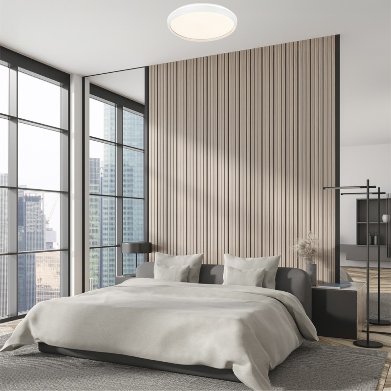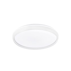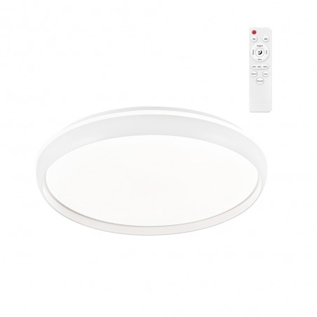 Charly dimmable 3CCT LED ceiling flush light. Ceiling lamp 40 centimetres in diameter designed for the main lighting in a bedroom or living room. It has integrated LED lighting with three intensities (20-50-100%) and three colour shades (3000-4000-6000K), as well as being able to regulate both gradually. It has a night mode light configuration, switch-on memory and timer (1-2H) for programming the switch-off. Remote control included. LED 46W, 5060 lm. and 3CCT.