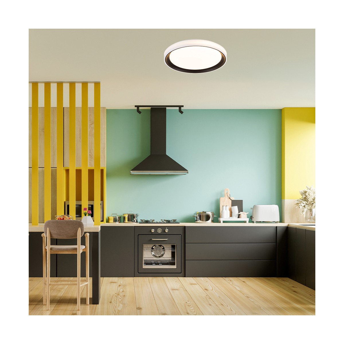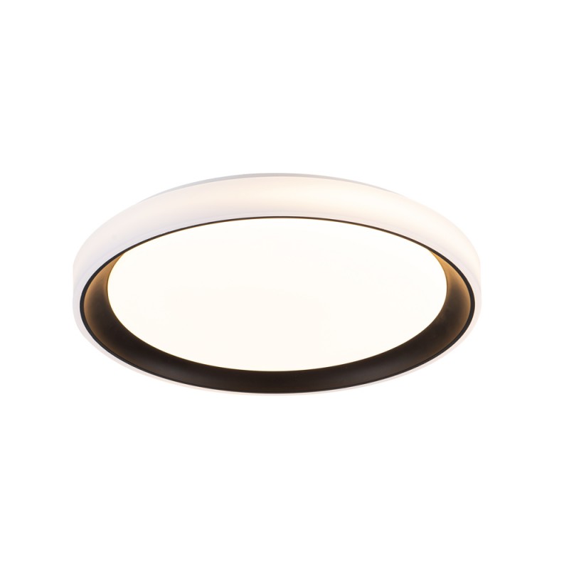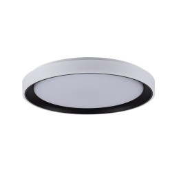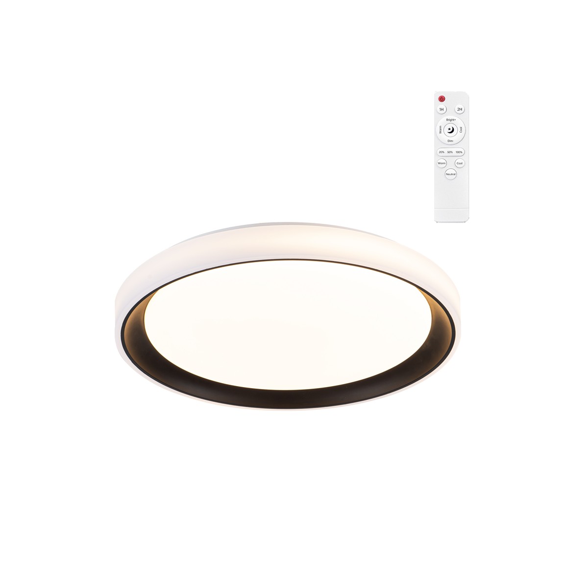 Brisa dimmable 3CCT LED ceiling fush light. Ceiling lamp measuring 50 centimetres designed for the main lighting in a bedroom or living room. It has integrated LED lighting with three intensities (20-50-100%) and three colour shades (3000-4000-6000K), as well as being able to regulate both gradually. It has a night mode light configuration, switch-on memory and timer (1-2H) for programming the switch-off. Remote control included. LED 72W, 7290 lm. and 3CCT.