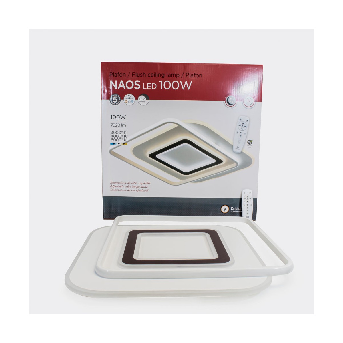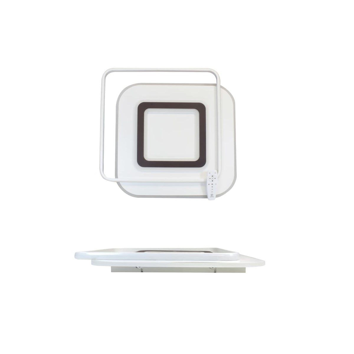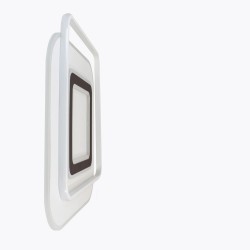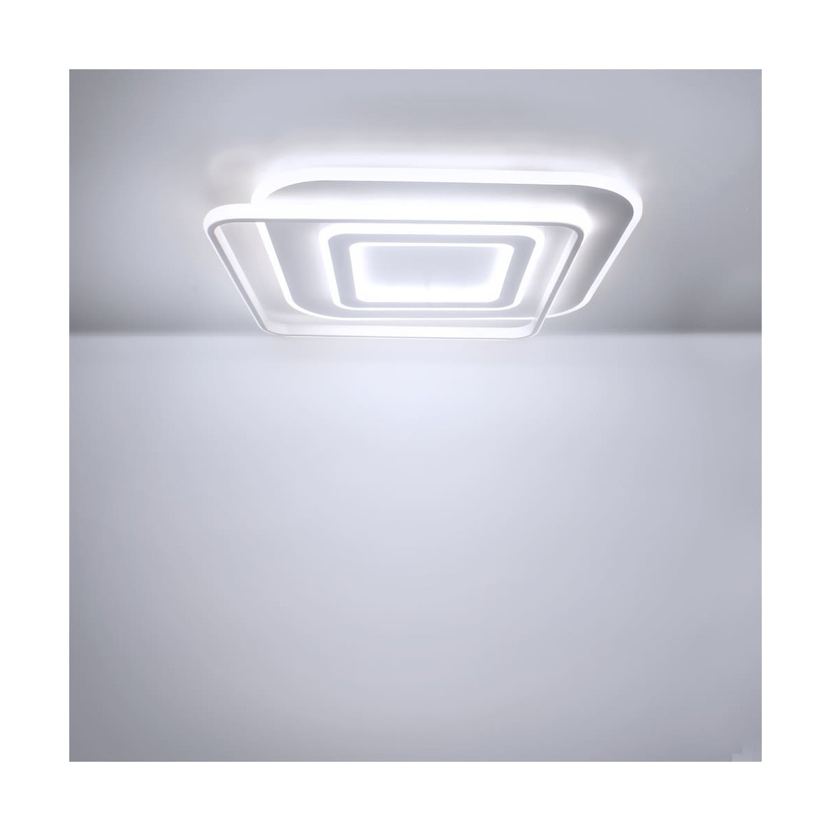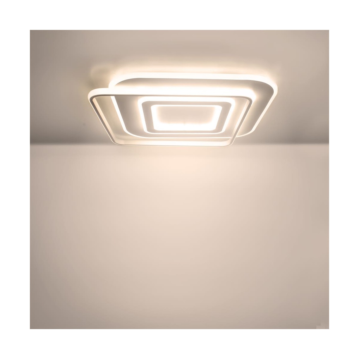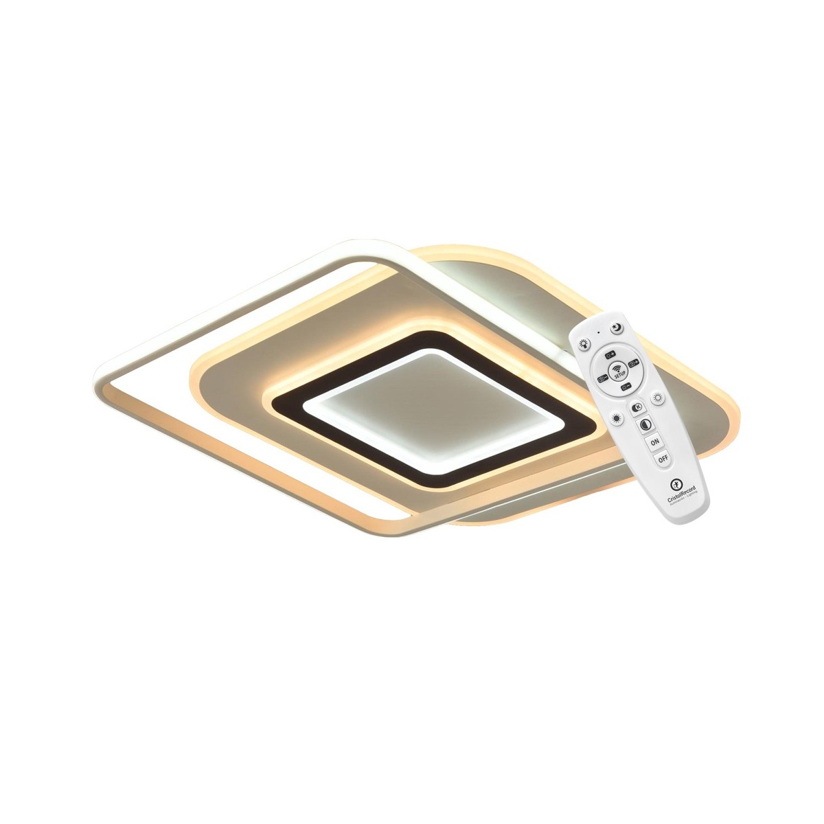 Decorative LED ceiling light formed by overlapping squares. Integrated 100W LED lighting with CCT temperature change and adjustable intensity with night light, with power memory function. Includes remote control which works with 2xAAA batteries