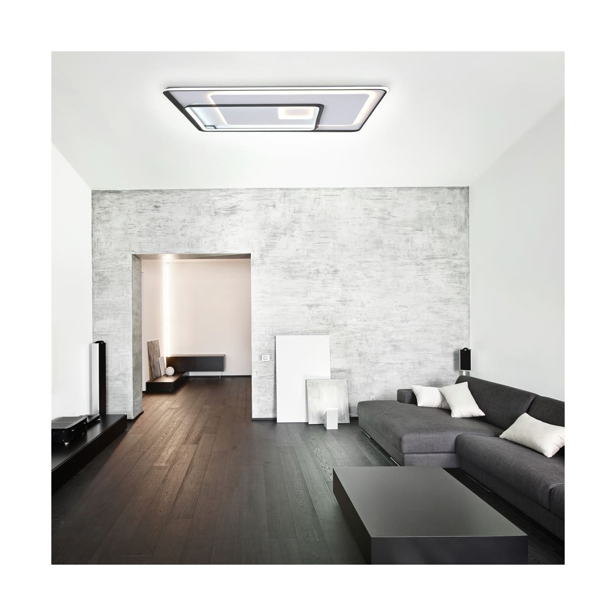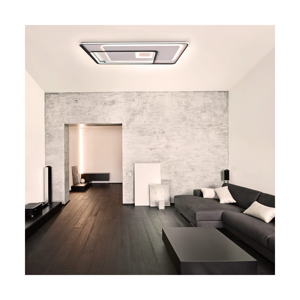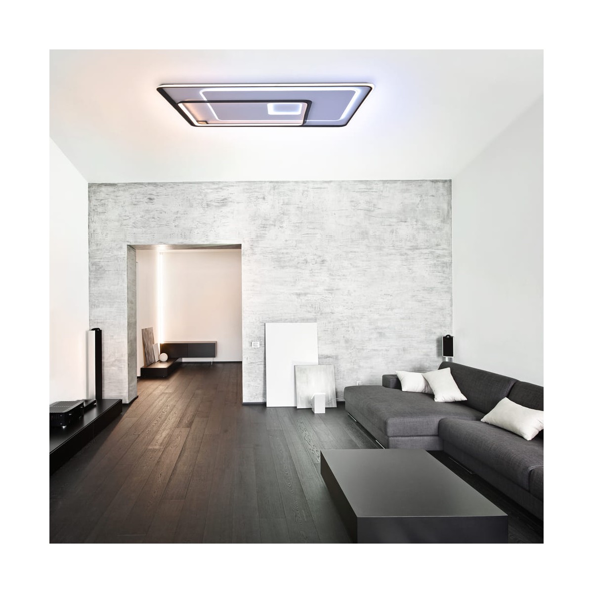 Decorative LED flush ceiling lamp with three-temperature light. The structure of the ceiling lamp creates different rings of light that can be combined with different shades of light to create different lights. With the control included, in addition to adjusting the light tone, the intensity can be regulated and switched on and off. It has a night lighting mode and a memory function to recover the last lighting set.