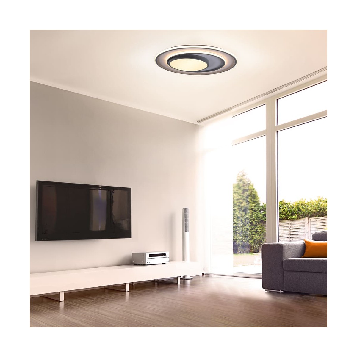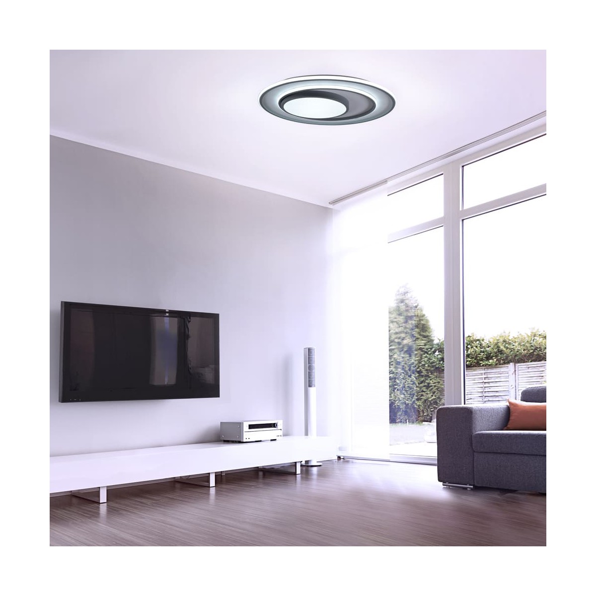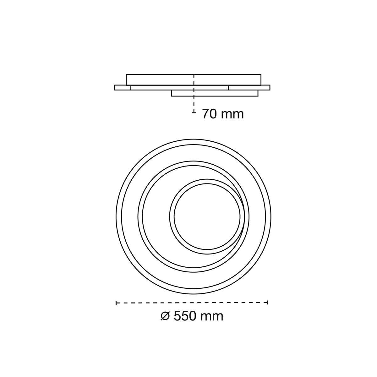 Decorative LED flush ceiling lamp with three-temperature light. The structure of the ceiling lamp creates different rings of light that can be combined with different shades of light to create different lights. With the control included, in addition to adjusting the light tone, the intensity can be regulated and switched on and off. It has a night lighting mode and a memory function to recover the last lighting set.