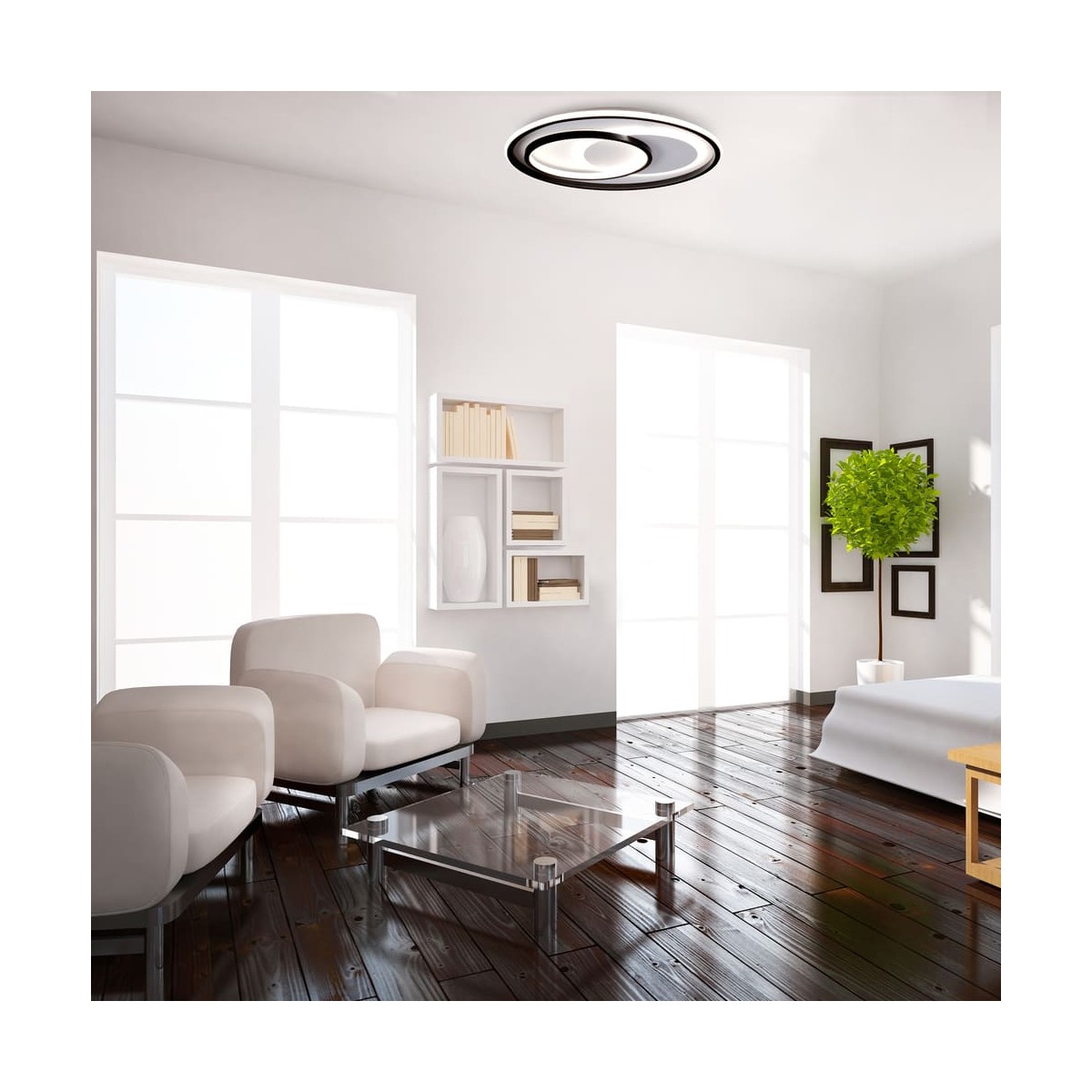 Decorative LED flush ceiling lamp with three-temperature light. The structure of the ceiling lamp creates different rings of light that can be combined with different shades of light to create different lights. With the control included, in addition to adjusting the light tone, the intensity can be regulated and switched on and off. It has a night lighting mode and a memory function to recover the last lighting set.