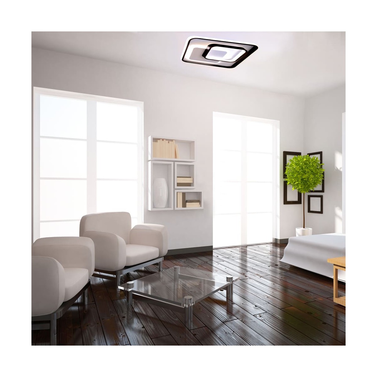 Decorative LED flush ceiling lamp with three-temperature light. The structure of the ceiling lamp creates different rings of light that can be combined with different shades of light to create different lights. With the control included, in addition to adjusting the light tone, the intensity can be regulated and switched on and off. It has a night lighting mode and a memory function to recover the last lighting set.