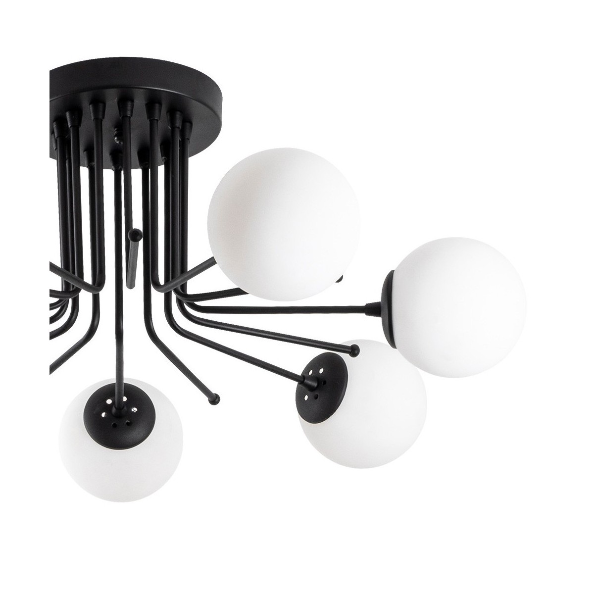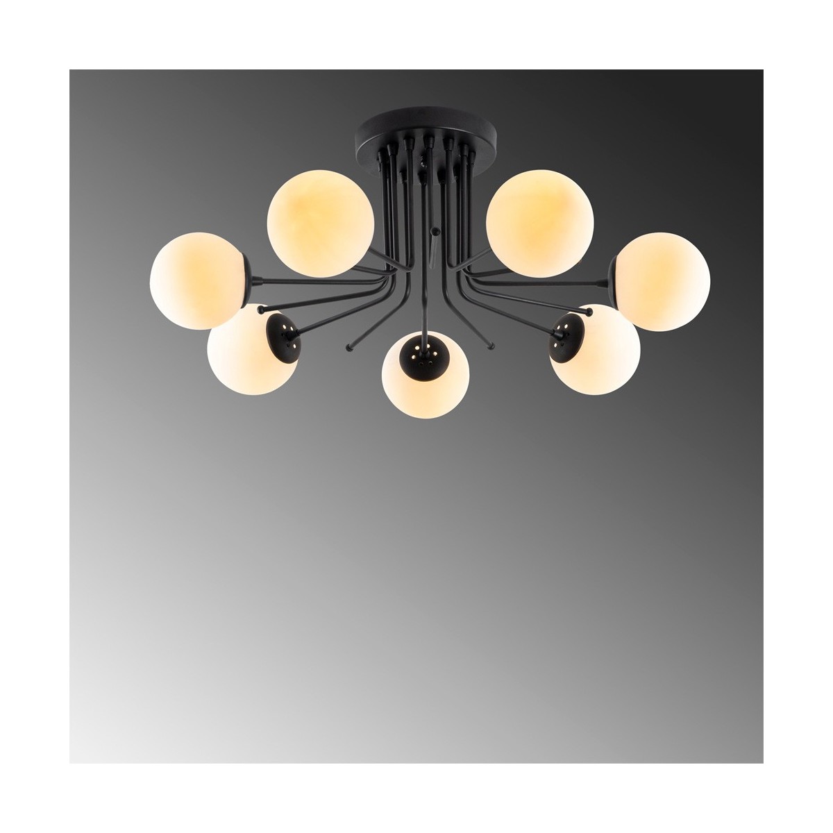 Decorative seven light ceiling lamp with black metal body and frosted glass lampshades. 34 cm high chandelier style. For E27 bulbs, not included.