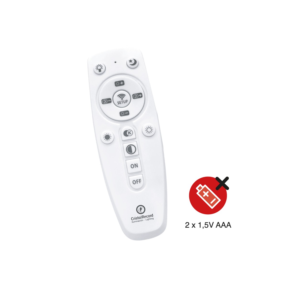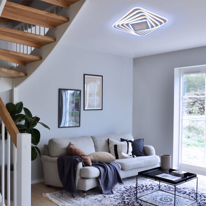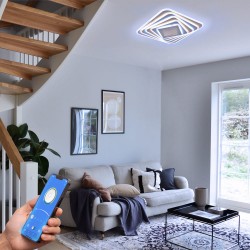 Decorative smart ceiling lamp with three light tones. Both from the mobile App and from the included remote control you can adjust the intensity and colour of the light and set the default night mode. It has a memory function to retrieve the last lighting set.
