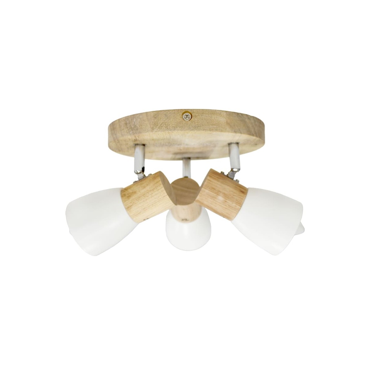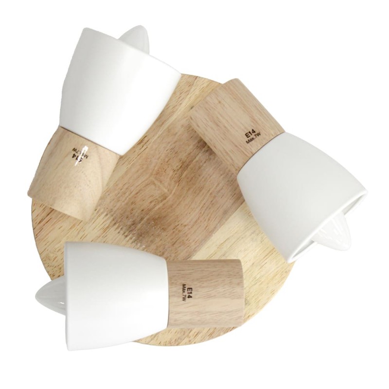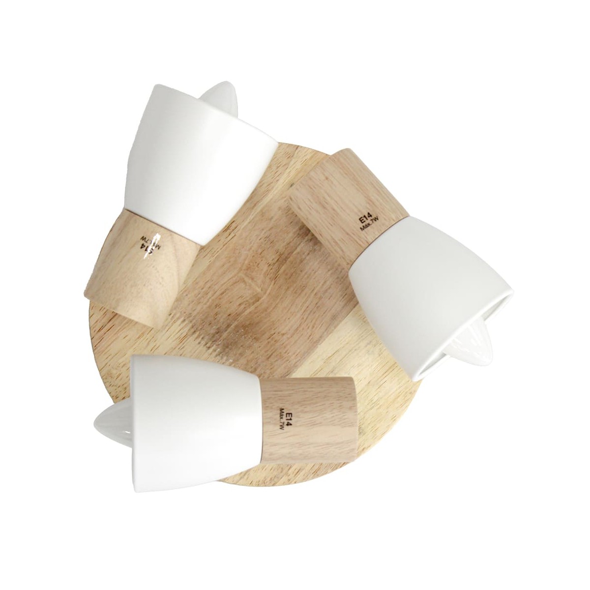 Decorative ceiling light with three matt white aluminium spotlights for E14 bulbs, not included. The spotlights can be moved to direct the light to the desired spot. The 20 cm round base is made of natural wood.