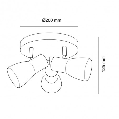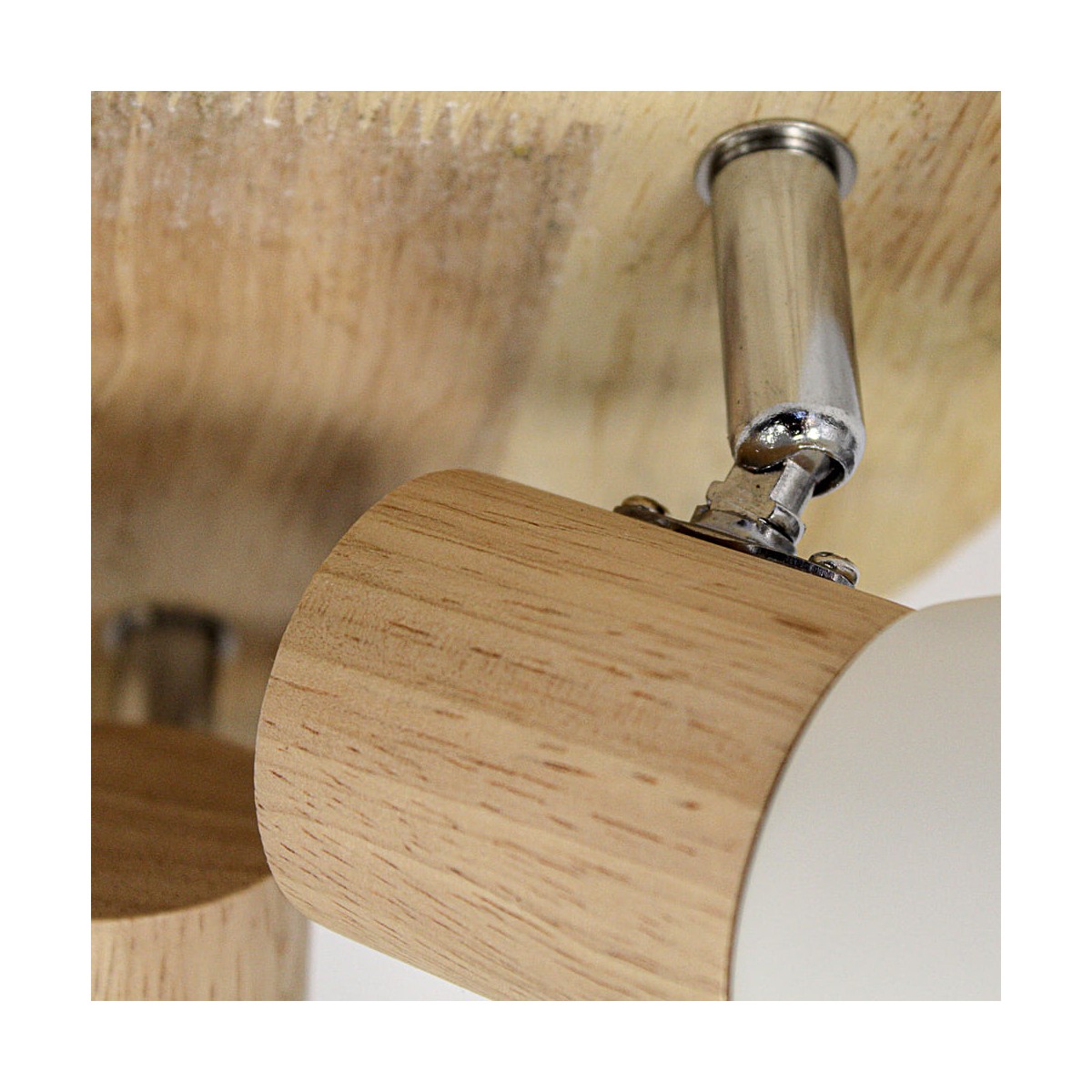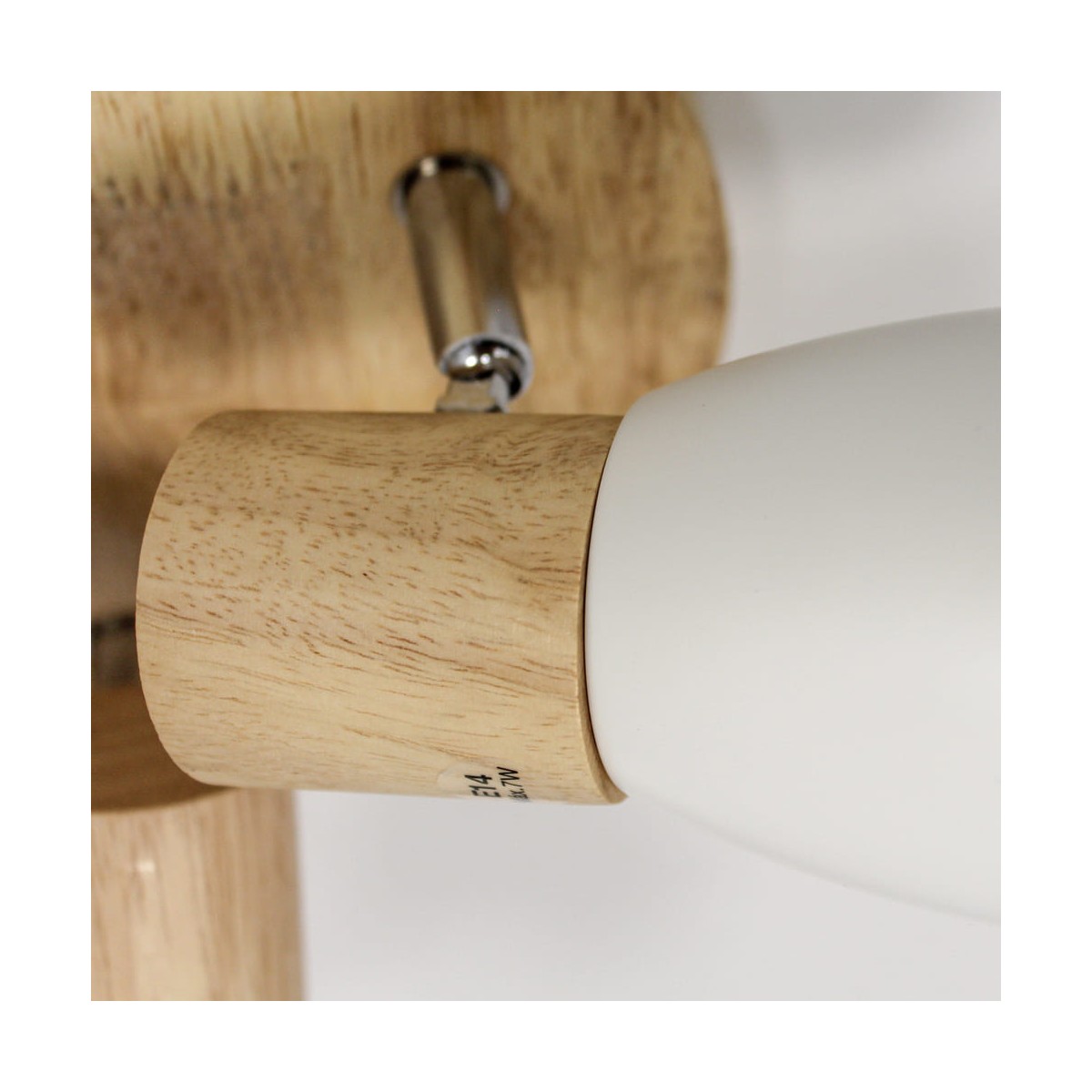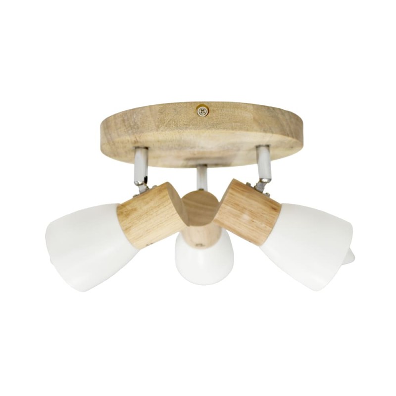 Decorative ceiling light with three matt white aluminium spotlights for E14 bulbs, not included. The spotlights can be moved to direct the light to the desired spot. The 20 cm round base is made of natural wood.