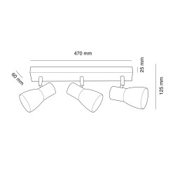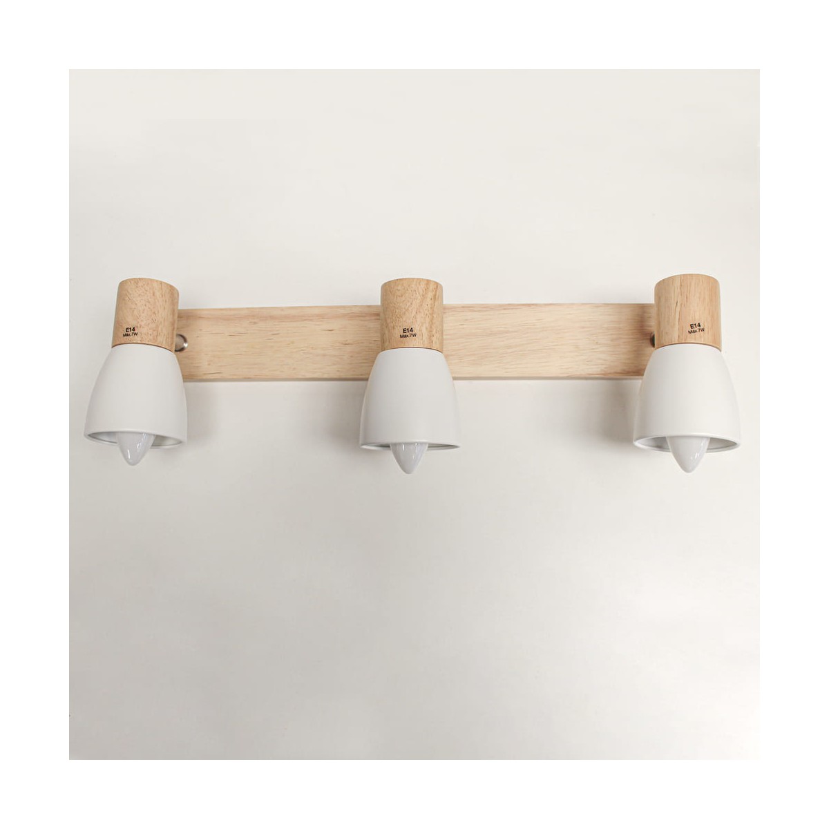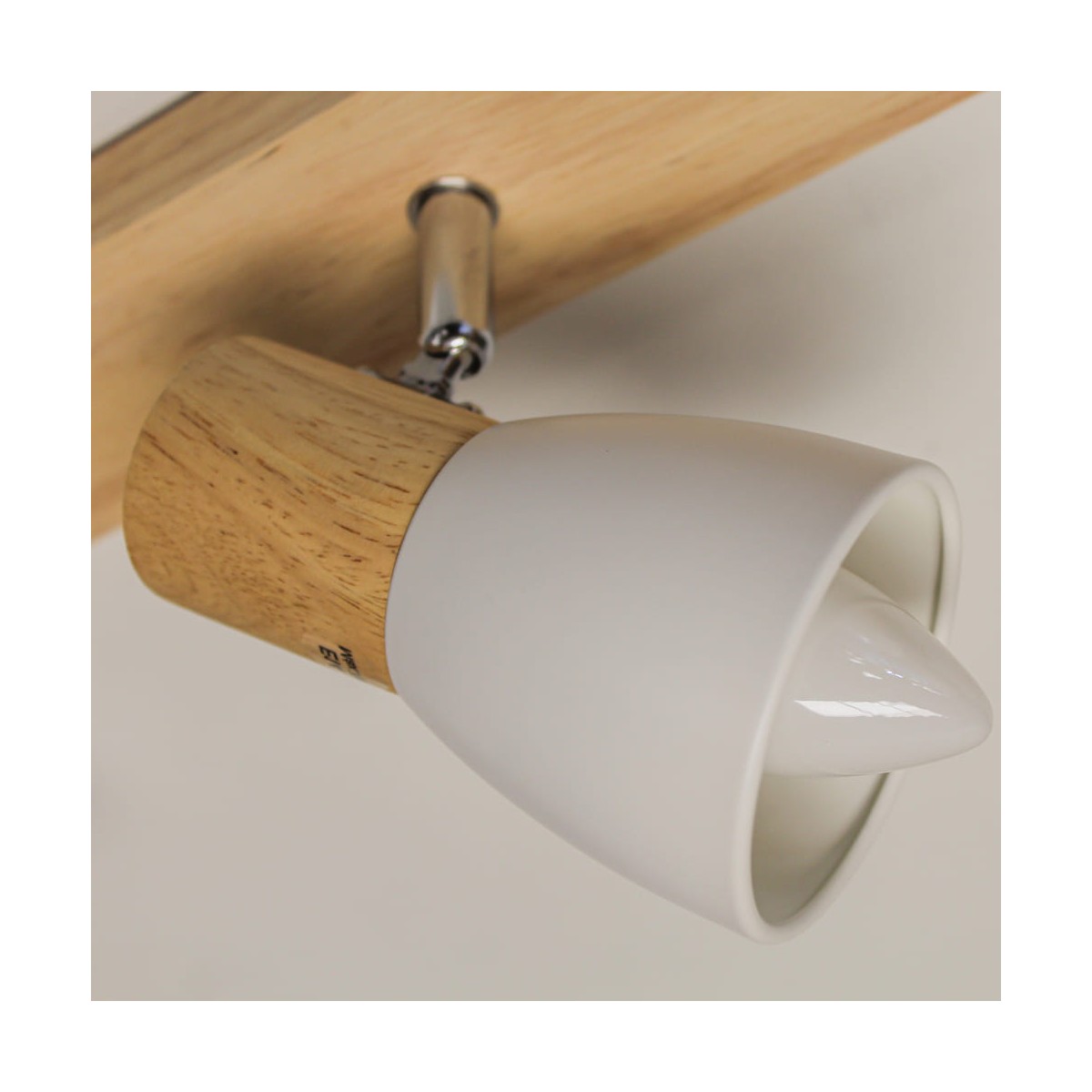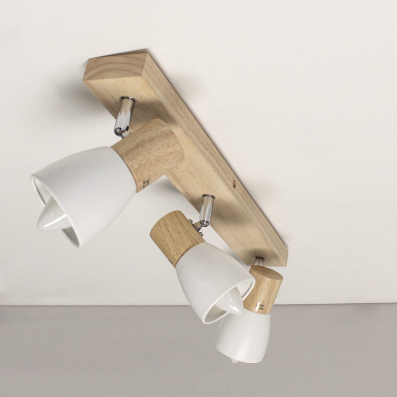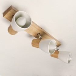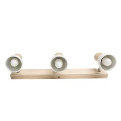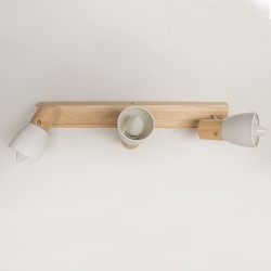 Decorative ceiling light with three aluminium spotlights for E14 bulbs, not included. The white lacquered spotlights can be moved to direct the light to the desired spot. The 67x6 cm base is made of natural wood.