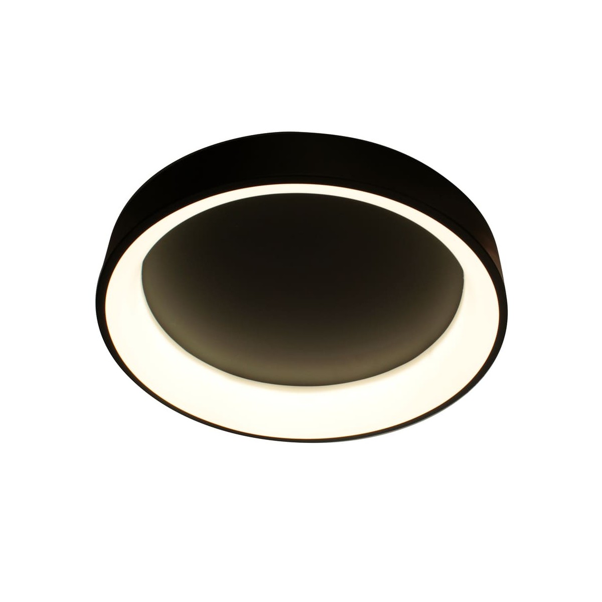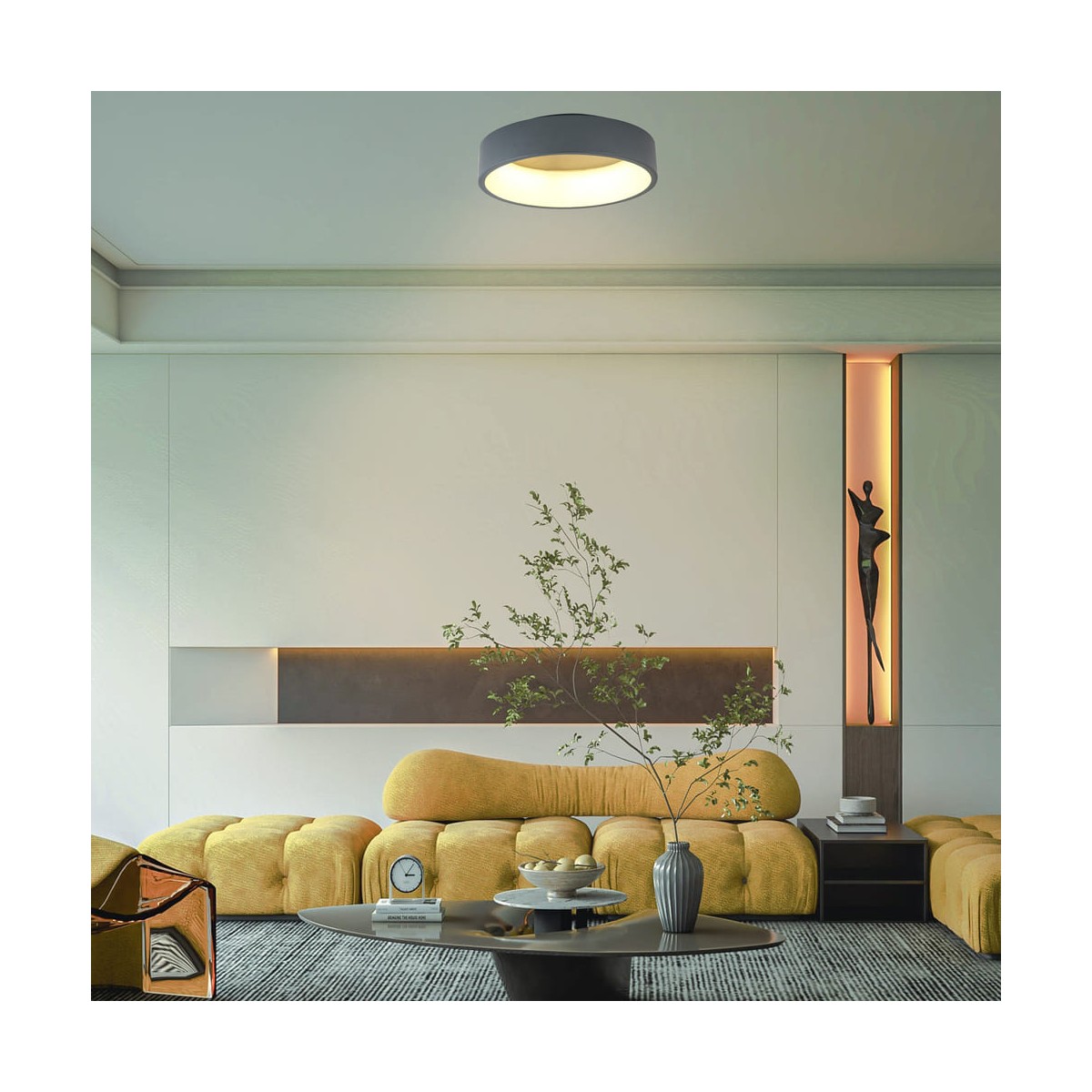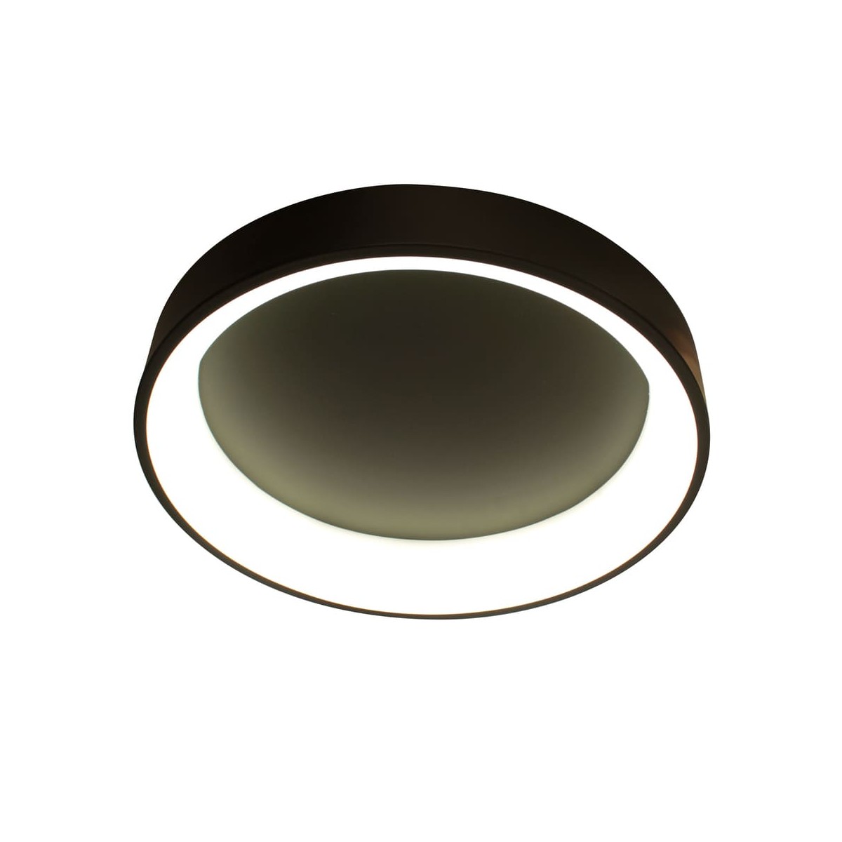 LED ceiling light with three colour temperatures. Circular ceiling light with remote control to regulate the intensity of lumens and the colour tone of the lighting. Made from anthracite grey aluminium and polycarbonate diffuser. It has a power-on memory, so that when it is switched on and off, the last light configuration is maintained.