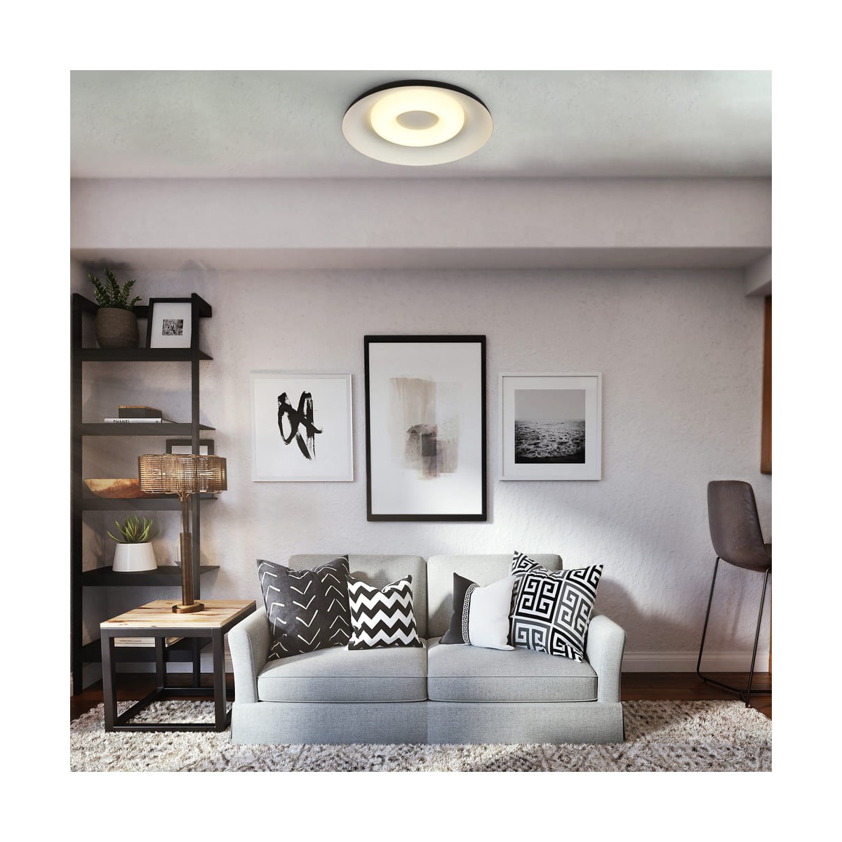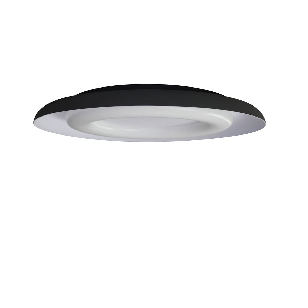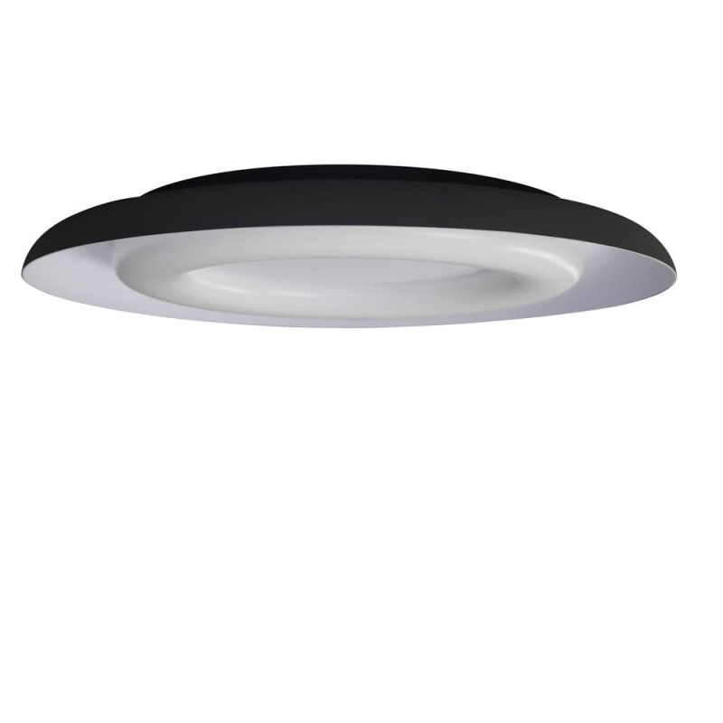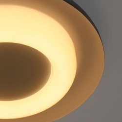 LED ceiling lamp for modern style living rooms. Circular ceiling lamp made of aluminium in black and white inside. The ceiling lamp has a polycarbonate diffuser through which a warm light of 36W and 2120 lumens is projected. Round ceiling lamp with integrated LED designed for a modern living room or bedroom.