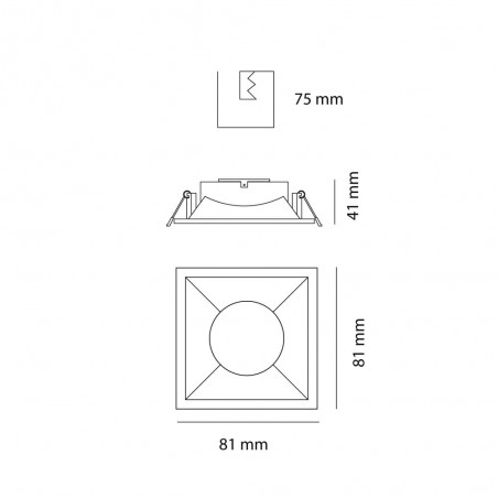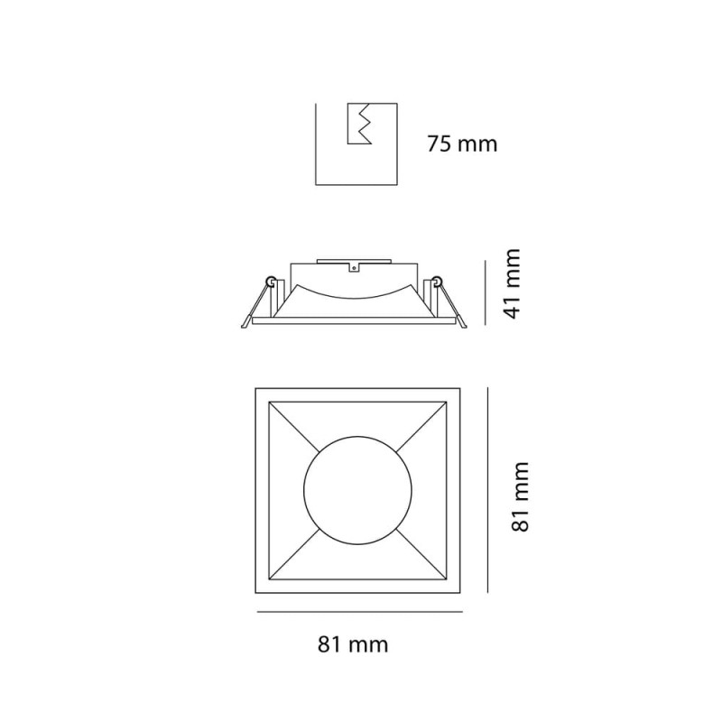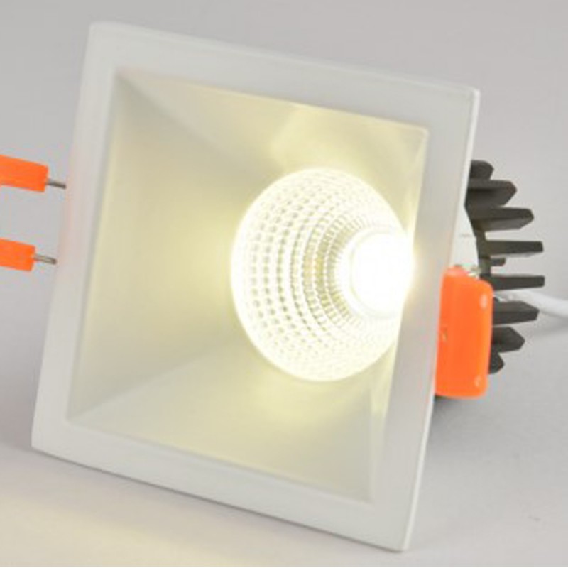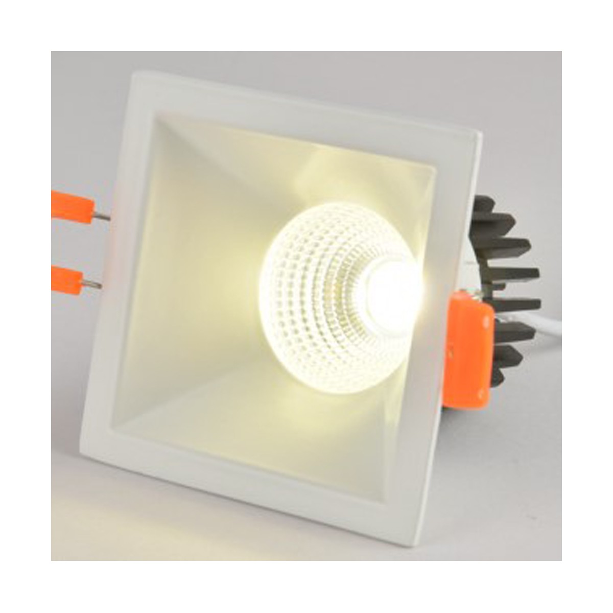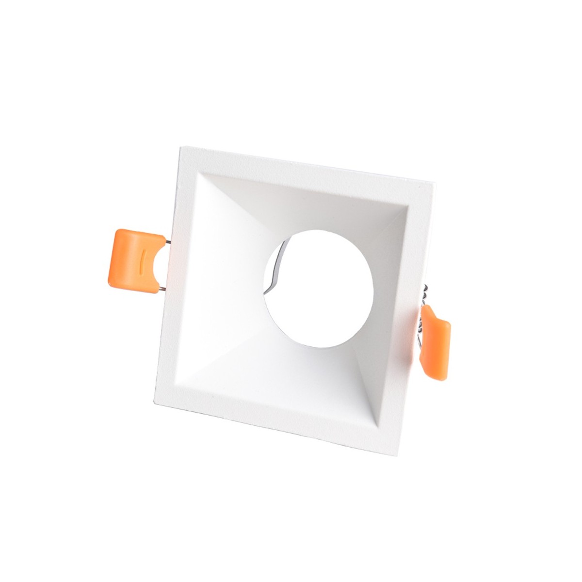 Square fixed recessed spotlight in aluminium with white finish. The bulb is replaced from the back of the recessed luminaire. The model is available in round and different finishes. A 75 mm diameter round hole in the ceiling is required for installation. Includes a GU10 lamp holder.