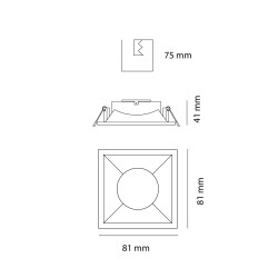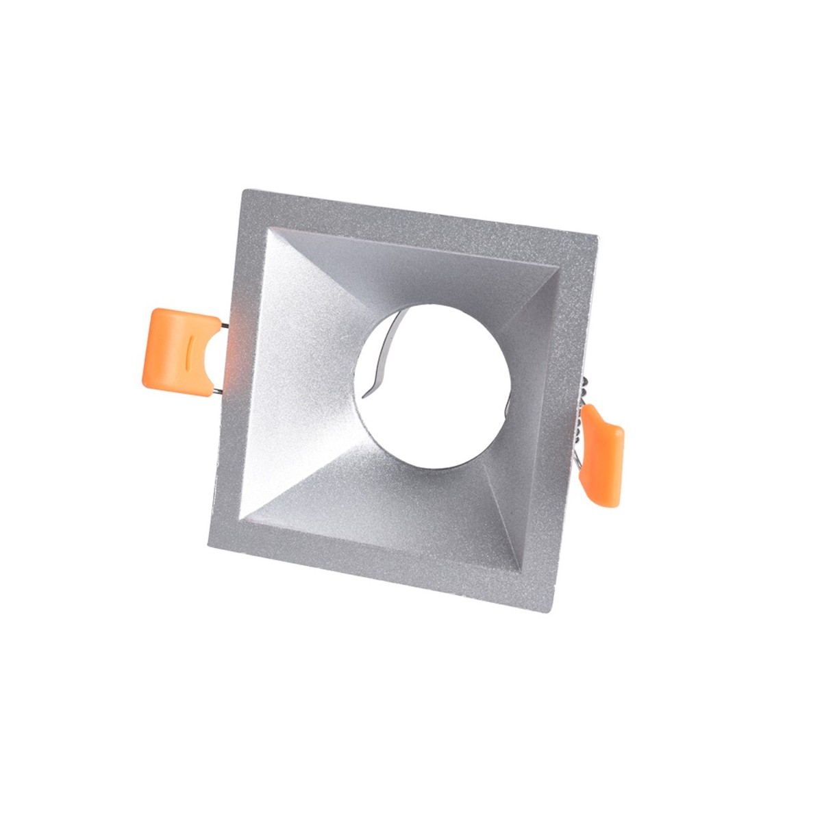 Square fixed recessed spotlight in aluminium with a silver finish. The bulb is replaced from the back of the recessed luminaire. The model is available in round and different finishes. A 75 mm diameter round hole in the ceiling is required for installation. Includes a GU10 lamp holder.