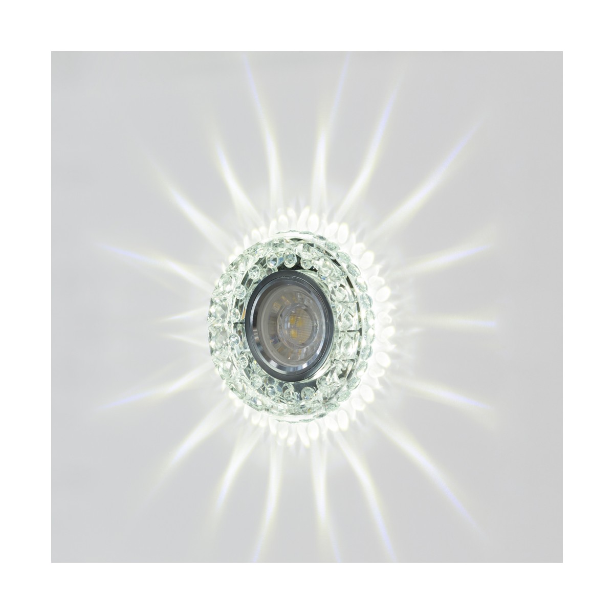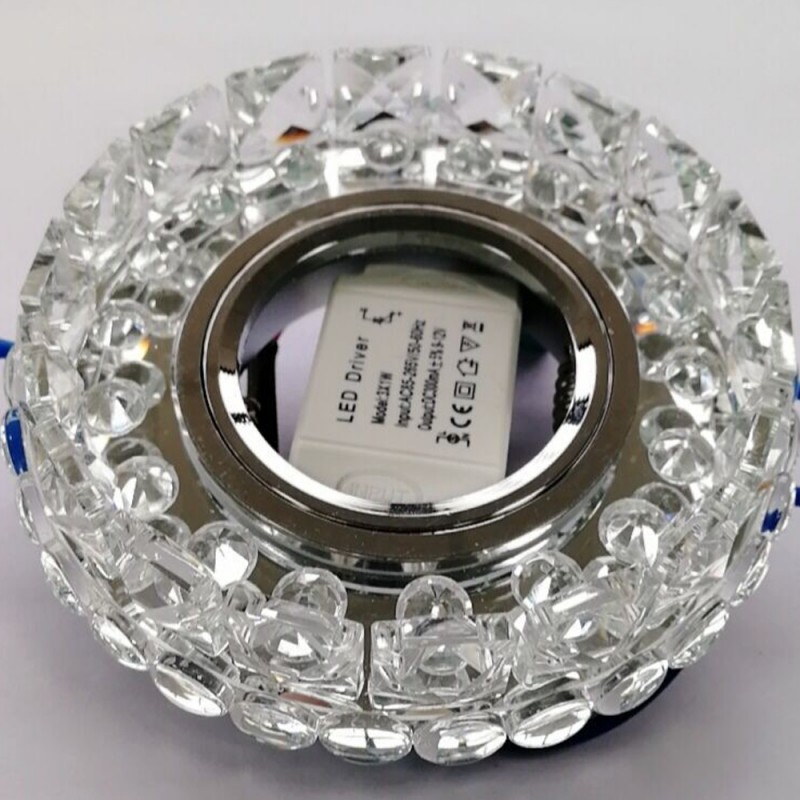Ilux Round Crystal LED Recessed Light GU10. Decorative recessed light made of small pieces of translucent glass. Two Lighting sources 3W LED neutral light and GU10 light bulb, not included, ceramic lampholder included. Three different switch-on options.