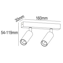 Slim adjustable spotlight strip with two spotlights. Aluminium tubular spotlights for G9 LED bulbs (not included). Each spotlight can be moved to direct the light to the desired spot. Sandblasted white finish. Ceiling or wall installation. Base 30x160 mm.