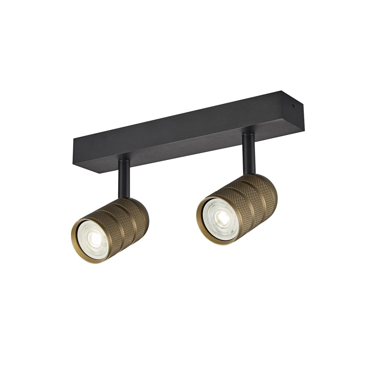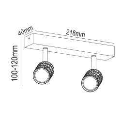 Ceiling strip with adjustable spotlights. The spotlights are designed to operate with GU10-35 bulbs (not included). Each spotlight can be moved individually to direct the light to the desired spot. Black base and gold spotlights. Base 40x218 mm.