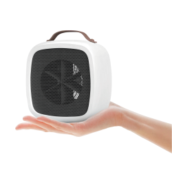 White portable heater with 500W power. Designed to warm hands, feet or small spaces such as desks and tables. Provides rapid heating in just 3 seconds.
