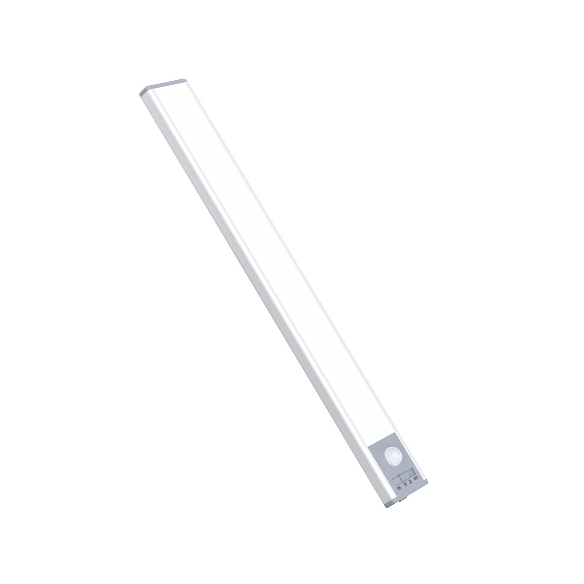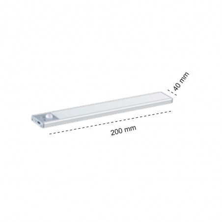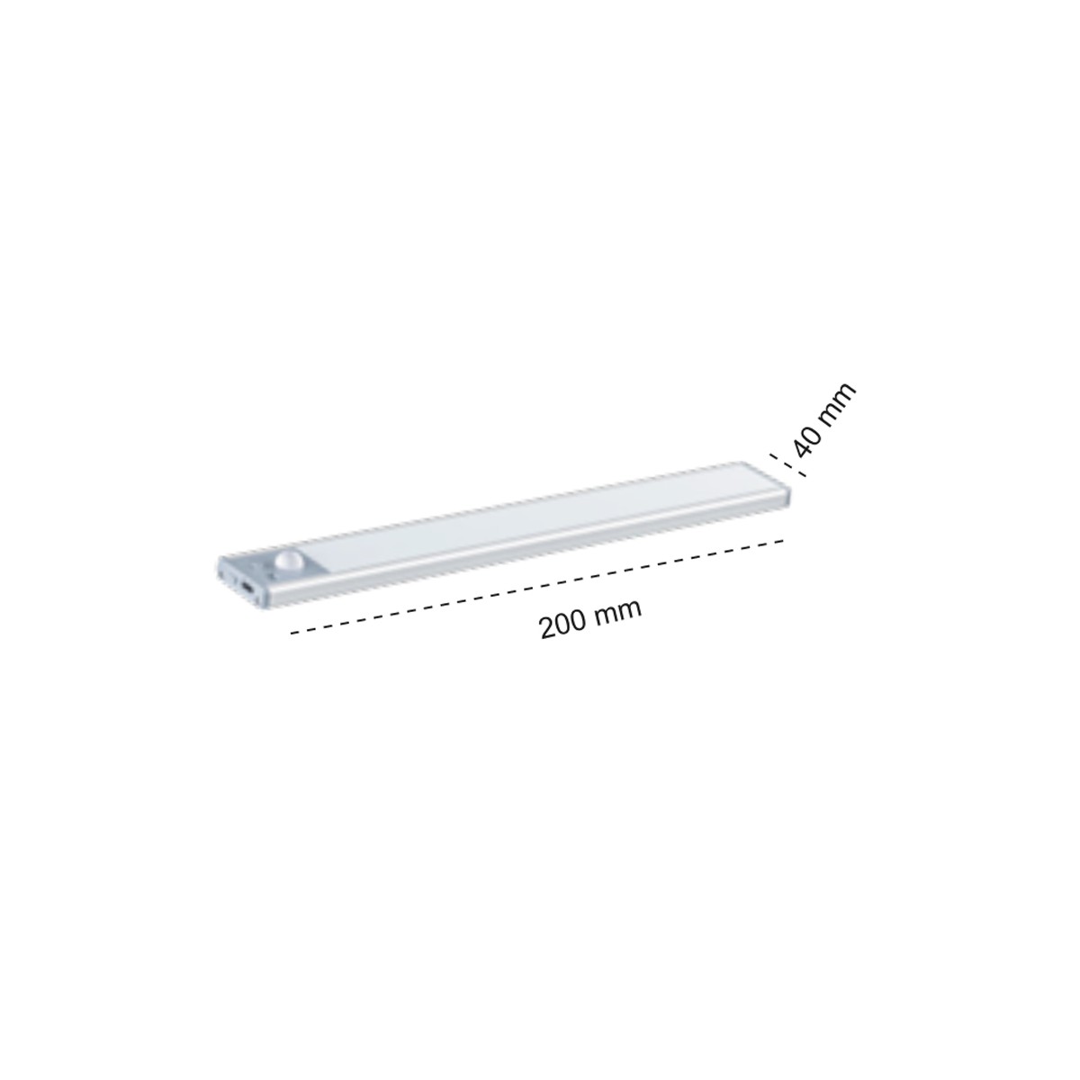 Linear LED under-cabinet light for kitchens and bedrooms. 1W power, 80 lumens light output and three colour temperatures. 2200 mAh battery with USB-C port charging (5V-1A). Provides approximately 7 hours of battery life and a charging time of 3 hours. Includes a motion sensor with a detection range of 120° and a distance of 4 to 6 metres. Automatically switches off after 20 seconds. Magnetic installation (easy to install).