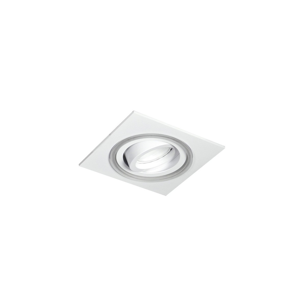 Recessed LED Light designed in a circular shape and finished in white fitted in a white squared frame. Adjustable downlights are a discreet way to add a modern feel to your home. This model has three lights in one: cold ambient LED light provided by the acrylic ring, direct light from the LED bulb, and a combined lighting result of mixing both. Includes fitting GU5.3 and GU10. Driver not included.
