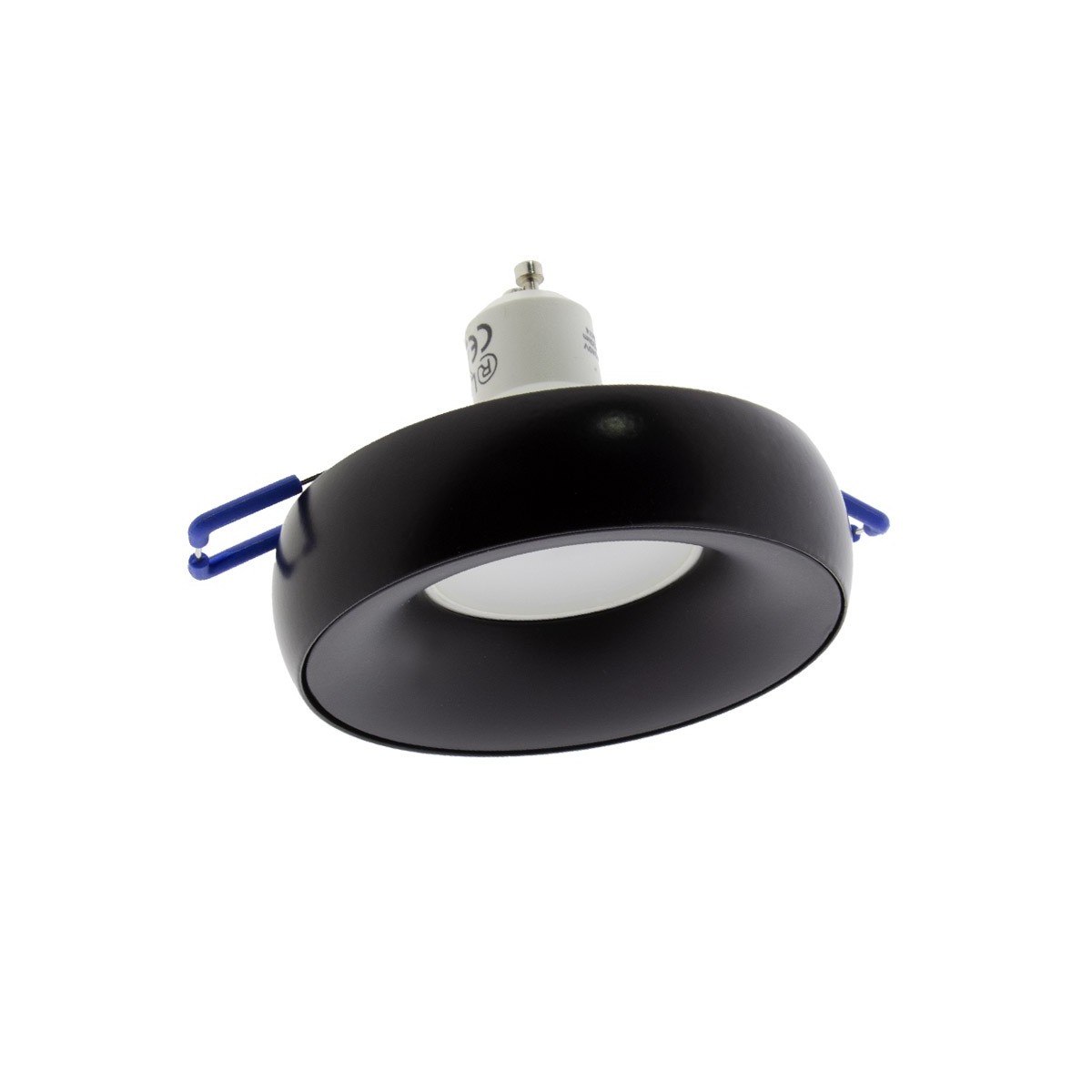 Nabila Black Round Recessed light, made of aluminium. This decorative recessed light is suitable for low ceilings, recessed cut of 65mm diameter. Includes a decorative ring that spots the light. 25 mm height and an external trim diameter of 93 mm. Works with GU10 light bulb, not included. A ceramic lamp holder GU10 included. Also available in 3 different finishes, gold, silver and white. Perfect for low ceilings. This elegant black colour recessed light is a great choice for lighting projects.