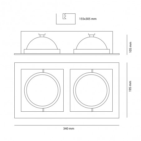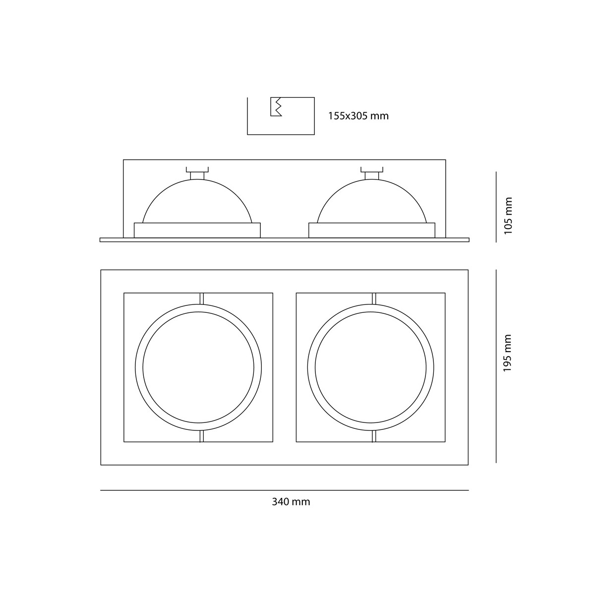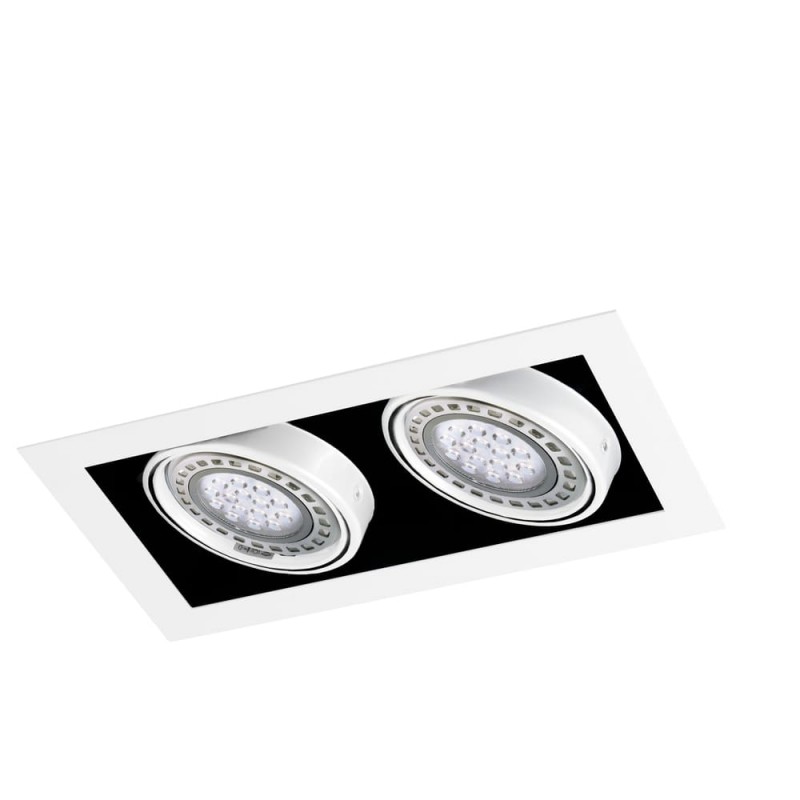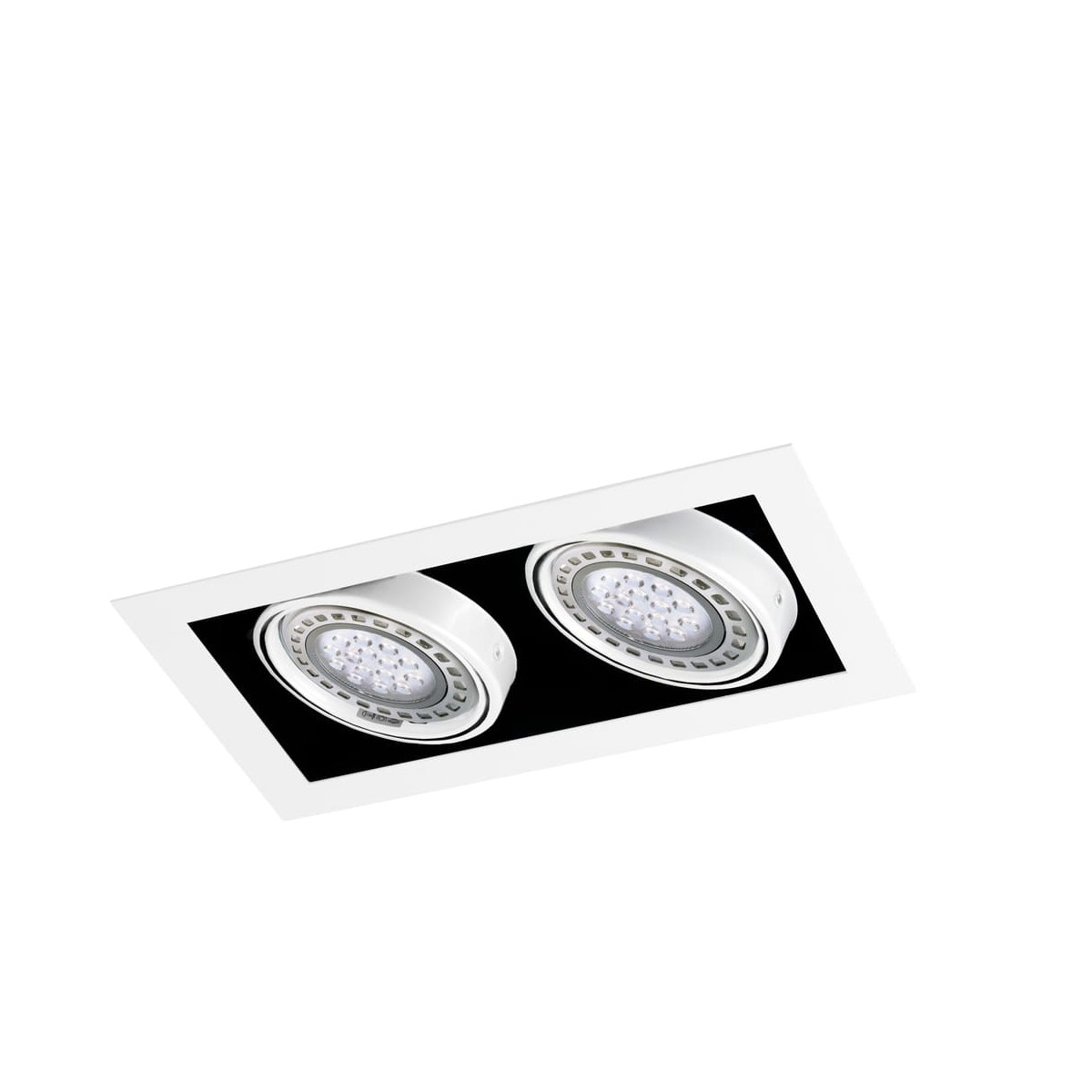 Two-light recessed spotlight for QR111 bulbs with GU0 lampholder included. Made of white lacquered aluminium. The lights are adjustable independently. Perfect for professional and industrial lighting.