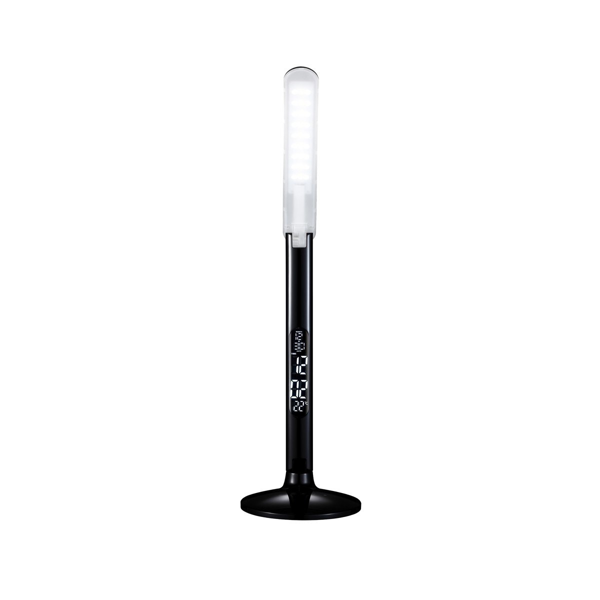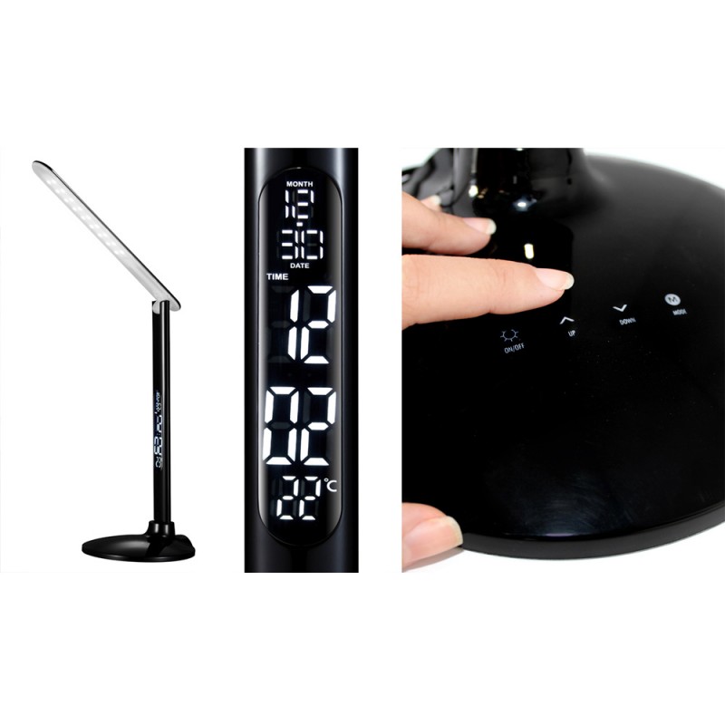 LED desk lamp designed in black PC. It has a really cool and modern look being the perfect lamp for a young room. It has a USB port to charge mobile phones and it works by touch control. The light is dimmable in 5 intensities and 3 light colours (warm, neutral and cold) and this model includes a digital screen with clock, alarm function, calendar and thermometer (1x3V button battery included)