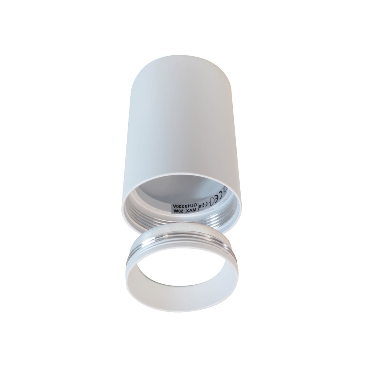 Fixed cylindrical ceiling spotlight for GU10 bulb, easy to install and replace the bulb without disassembly. The spotlight is made of matt lacquered aluminium. Perfect to focus the lighting.