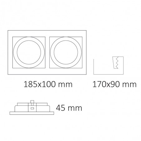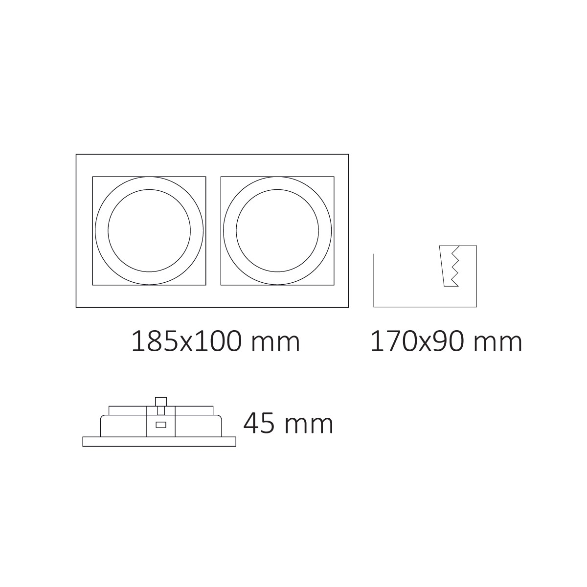 Aluminium recessed spotlight, rectangular with easy bulb replacement from front side. Includes GU10 lampholder.