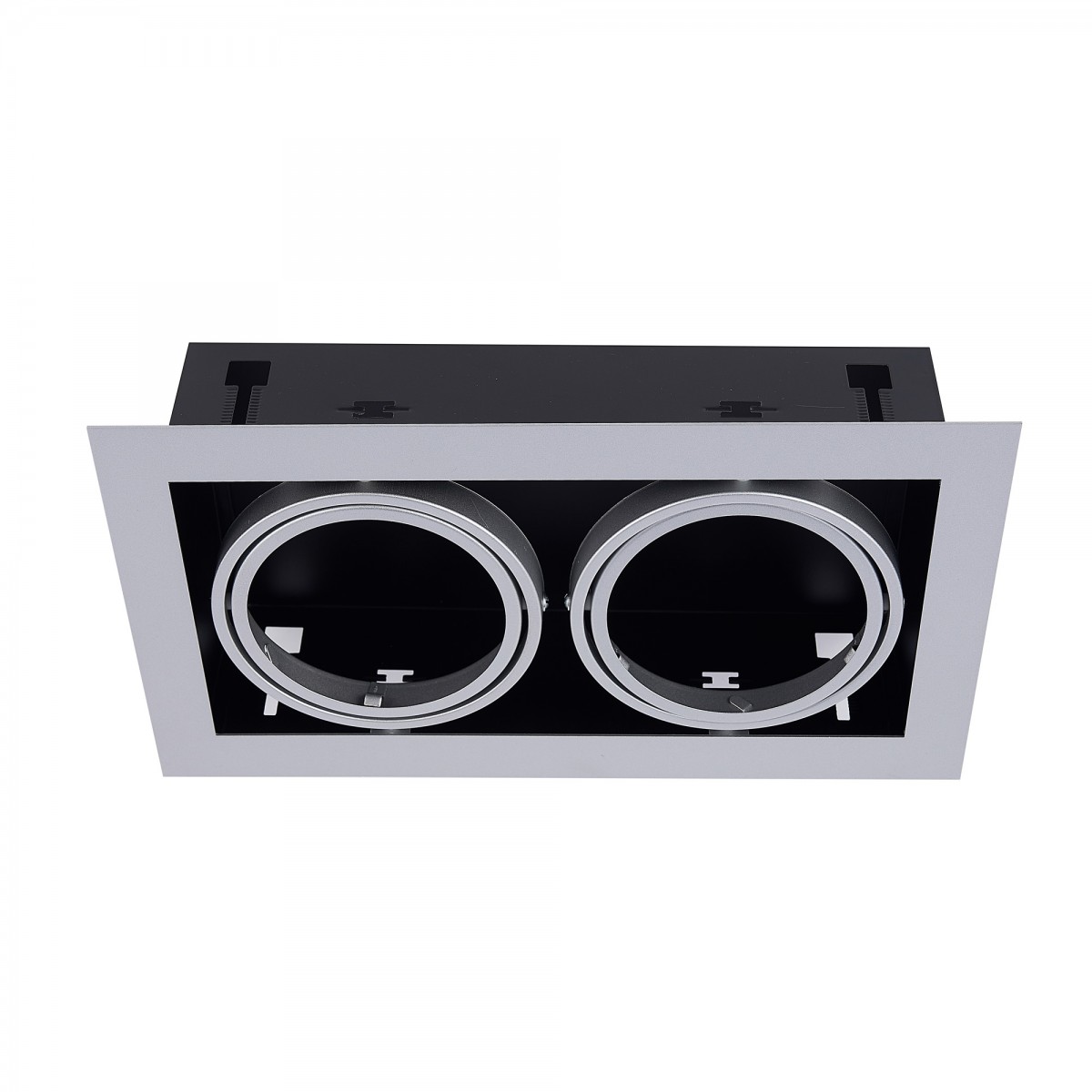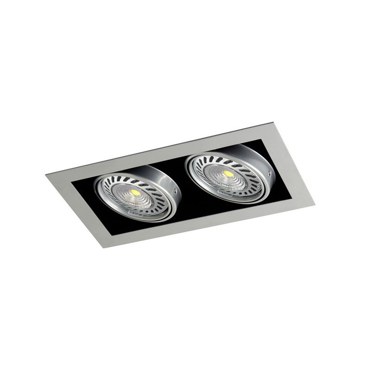 Recessed spotlight with two lights for QR111 bulbs with GU0 lampholder included. Made of steel with aluminum finish. The lights are adjustable independently. Perfect for professional and industrial lighting.