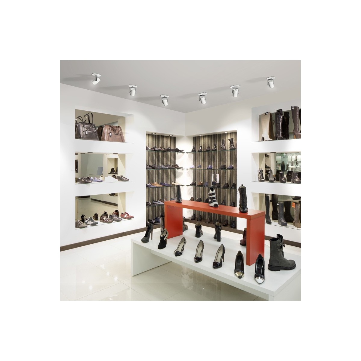 Modern single spotlight designed in a white finish with an adjustable head. This type of lighting is a very versatile option allowing you to direct the light where you need it. They are the perfect solution for big rooms, commercial spaces, shop windows... 1xGU10 max. 50W (bulb not included).