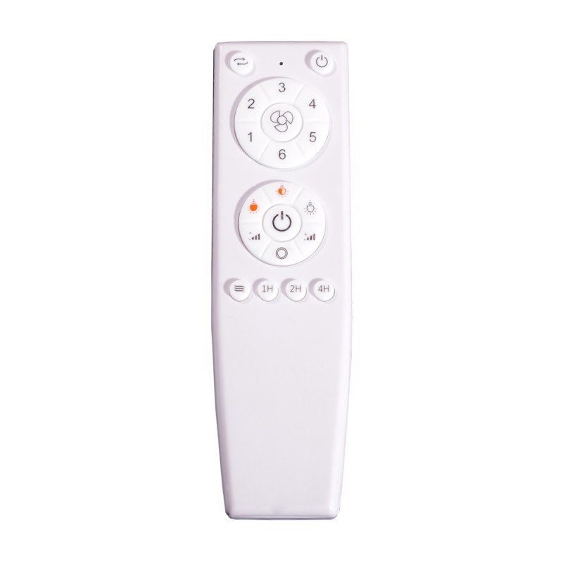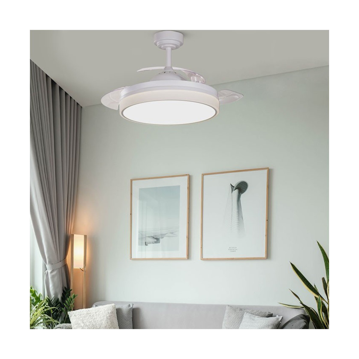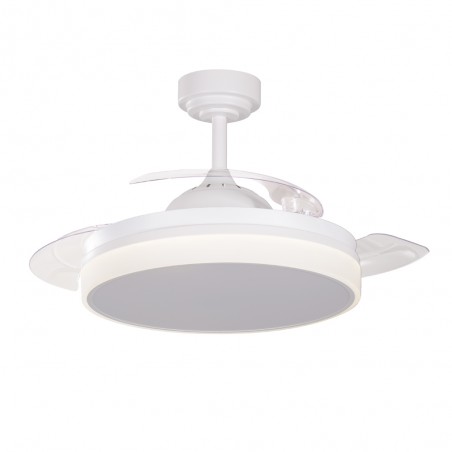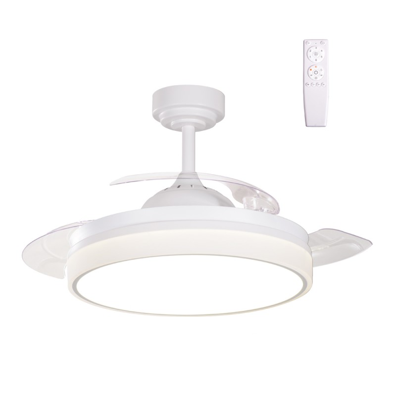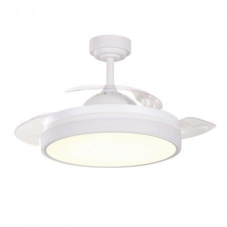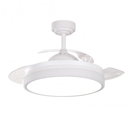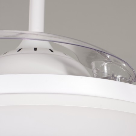 Quiet ceiling fan with six rotational speeds. Modern ceiling fan with retractable blades and integrated LED lighting, ideal for installation in medium-sized living rooms and bedrooms (13-20 square metres). The fan is white in colour and the transparent blades are retracted when not in operation. Remote control included to control both lighting and fan functions. Ultra-quiet DC motor. Vera Mini version available for smaller rooms.