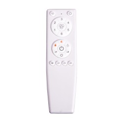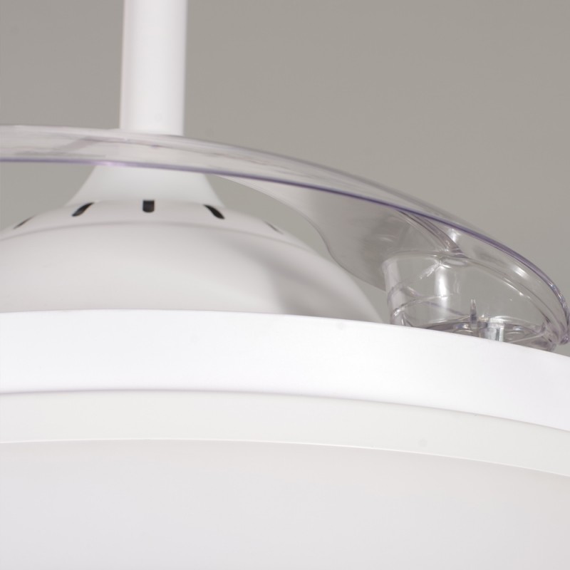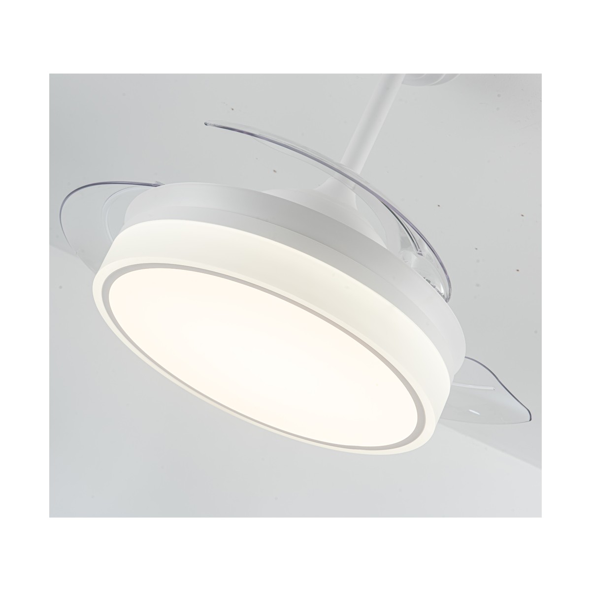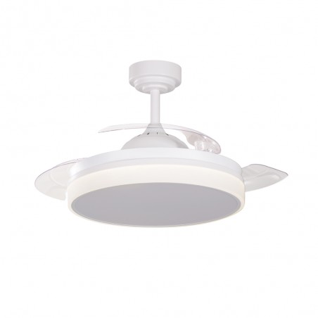 Ceiling fan with six-speed DC motor. Modern ceiling fan with retractable blades and integrated LED lighting, ideal for installation in living rooms and bedrooms as a source of light and airflow. The fan is white in colour and the transparent blades are retracted when not in operation. Remote control included to control both lighting and fan functions. Ultra-quiet DC motor with six speeds, timer and reverse function in winter and summer.