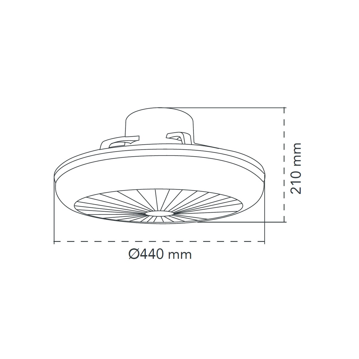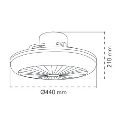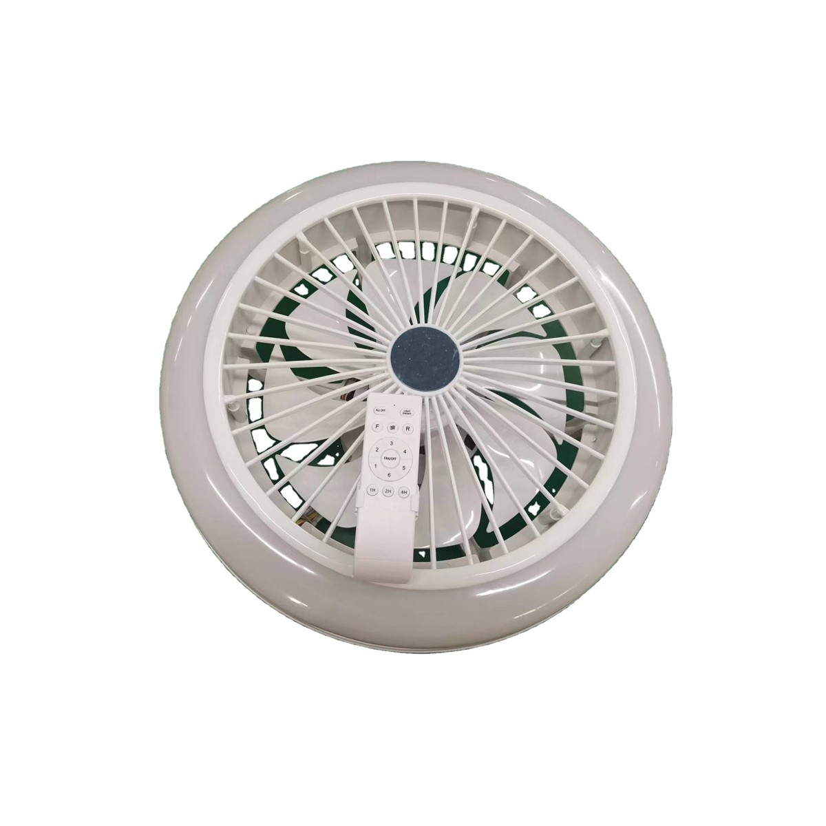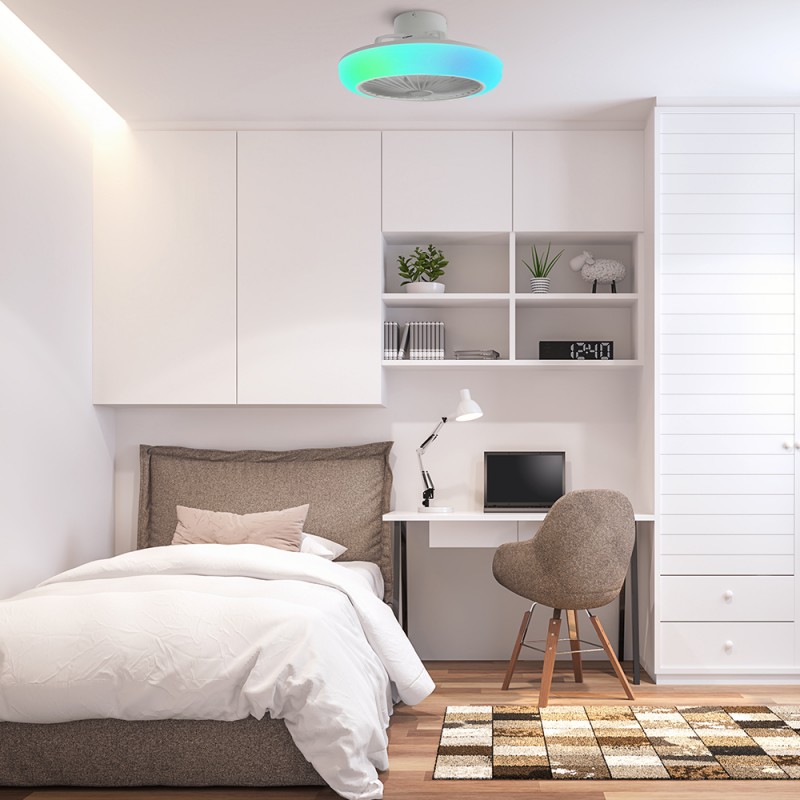 Ceiling fan with speaker and RGB LED lighting. Modern ceiling fan in the form of a ceiling light for the lighting of a youth bedroom. You can control the colour temperature, light intensity and set RGB colours. The blades are integrated inside the fan inside a grid. It has a speaker with bluetooth connection to play your favourite music.