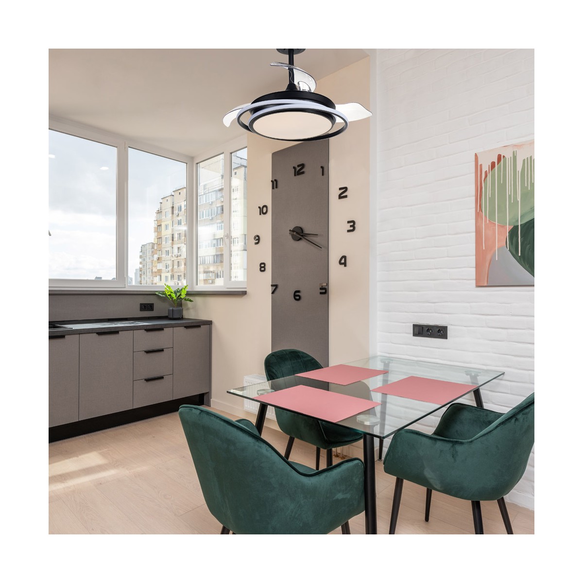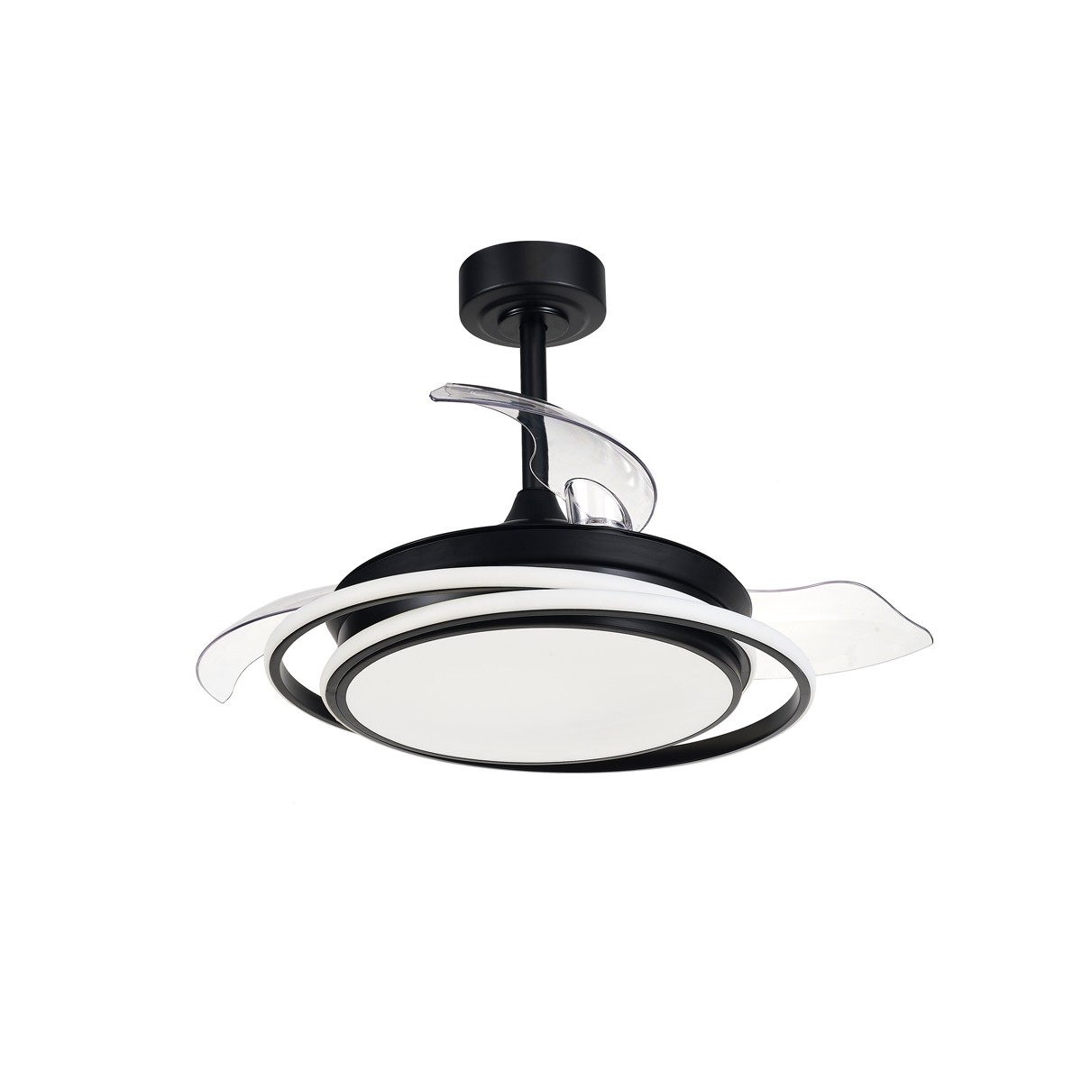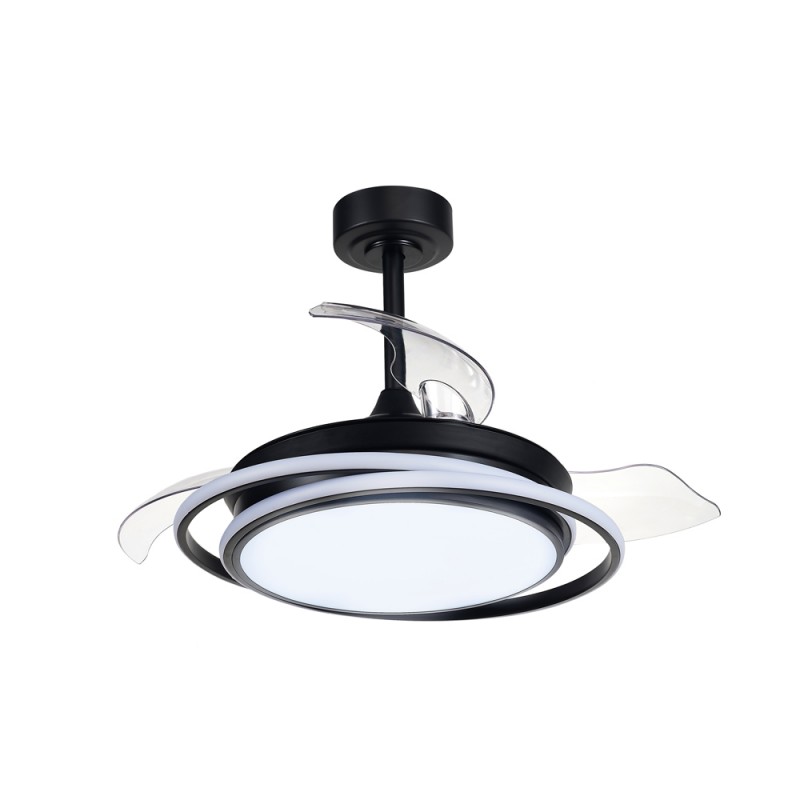 LED ceiling fan Antila Mini in black. Fan with ultra-quiet DC motor with six rotation speeds, reverse function winter summer and breeze. Its design with retractable blades means that when the fan is not in operation, the blades are retracted on top of the fan. This type of fan is very practical for lighting a bedroom or small living room. You can control the light individually, switching on just the main light, just the decorative ring or the whole fan at the same time as you need it. Dimmable LED lighting with three colour temperature tones.