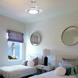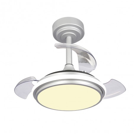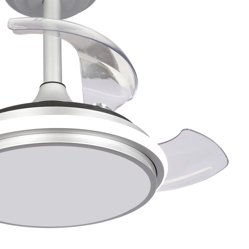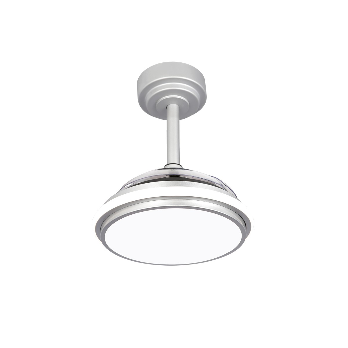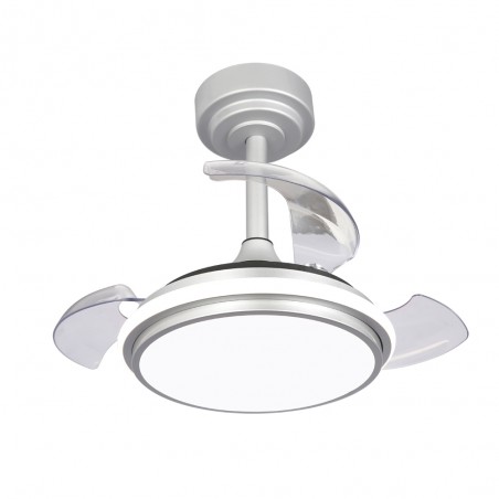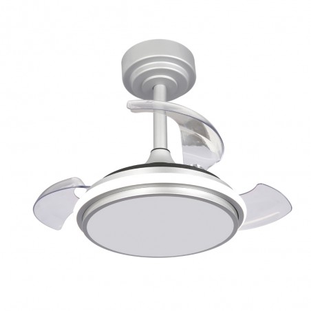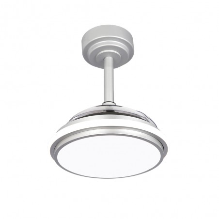 Antila Mini XS LED ceiling fan in grey. Fan with ultra-quiet DC motor with six rotation speeds, reverse function winter summer and breeze. Its design with retractable blades means that when the fan is not in operation, the blades are retracted on top of the fan. This type of fan is very practical for lighting a small bedroom because of its compact size and retractable blades. You can switch on just the main light, just the decorative ring or the whole fan at the same time with the remote control. Dimmable LED lighting with three colour temperature tones.