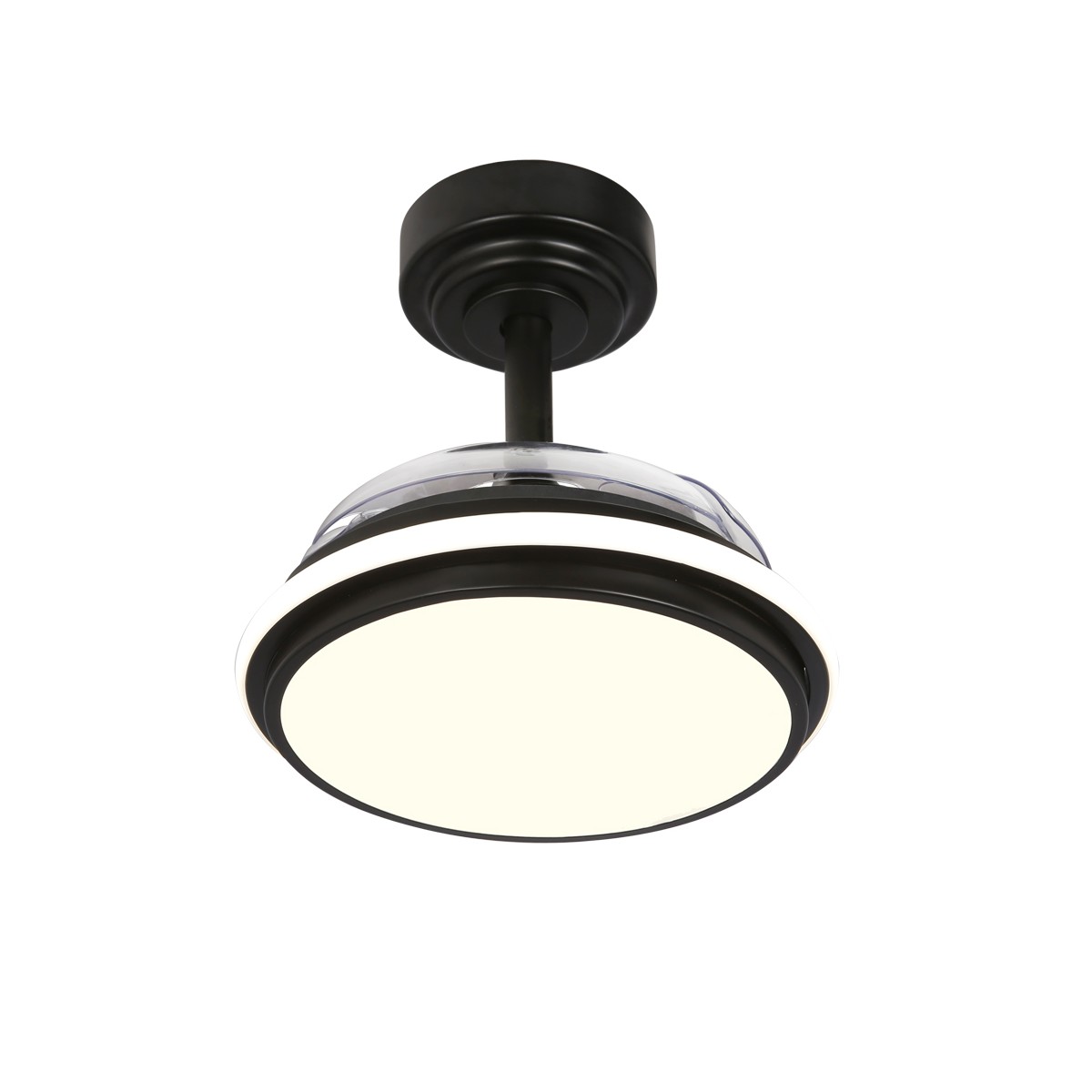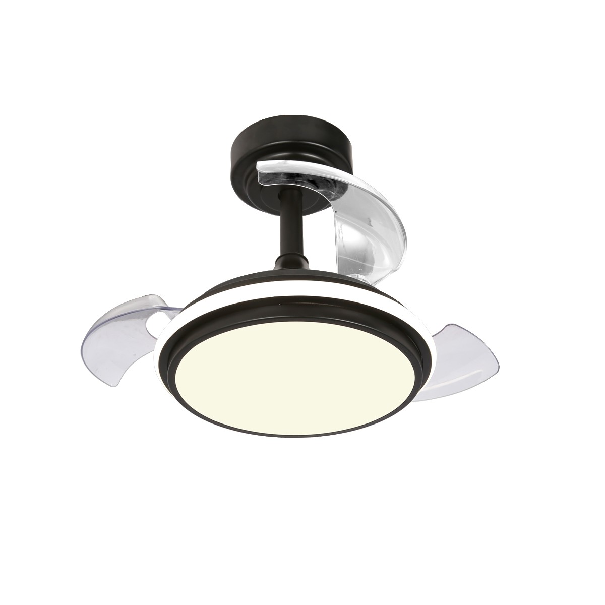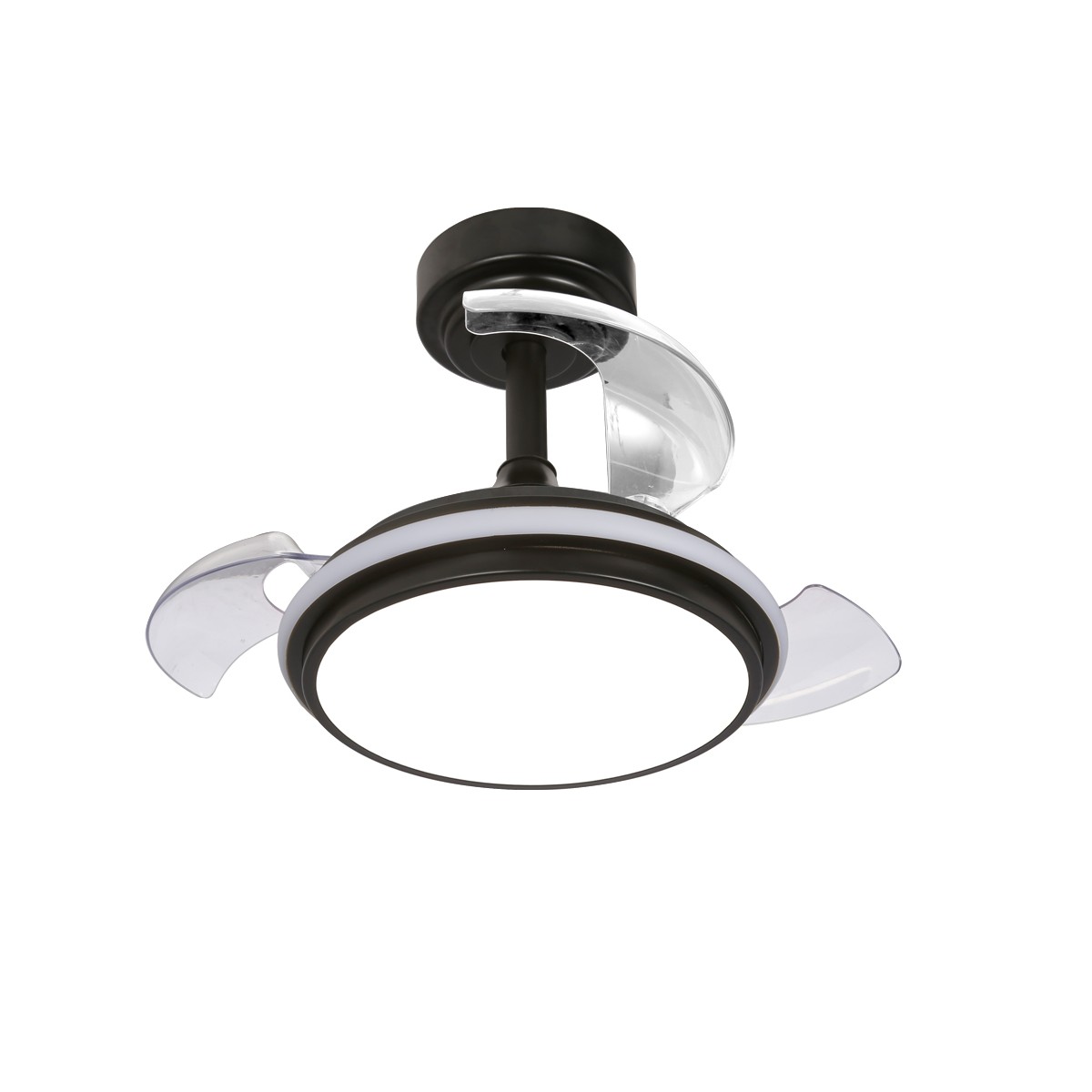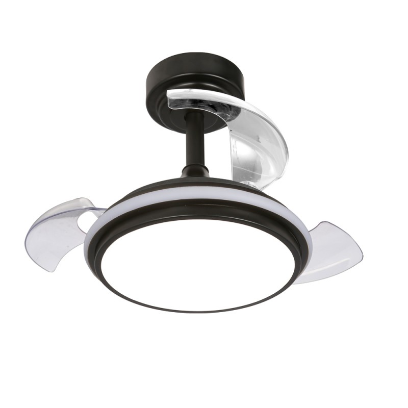 Antila Mini XS LED ceiling fan in black. Fan with ultra-quiet DC motor with six rotation speeds, reverse function winter summer and breeze. Its design with retractable blades means that when the fan is not in operation, the blades are retracted on top of the fan. This type of fan is very practical for lighting a small bedroom because of its compact size and retractable blades. You can switch on just the main light, just the decorative ring or the whole fan at the same time with the remote control. Dimmable LED lighting with three colour temperature tones.