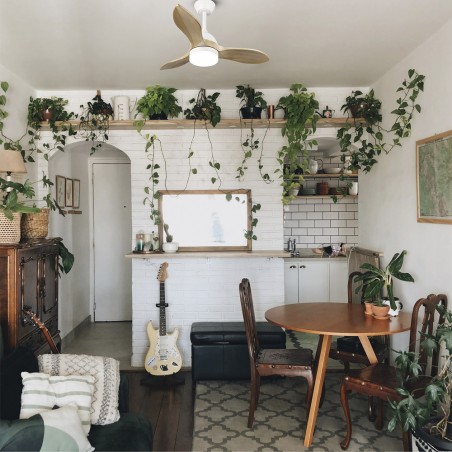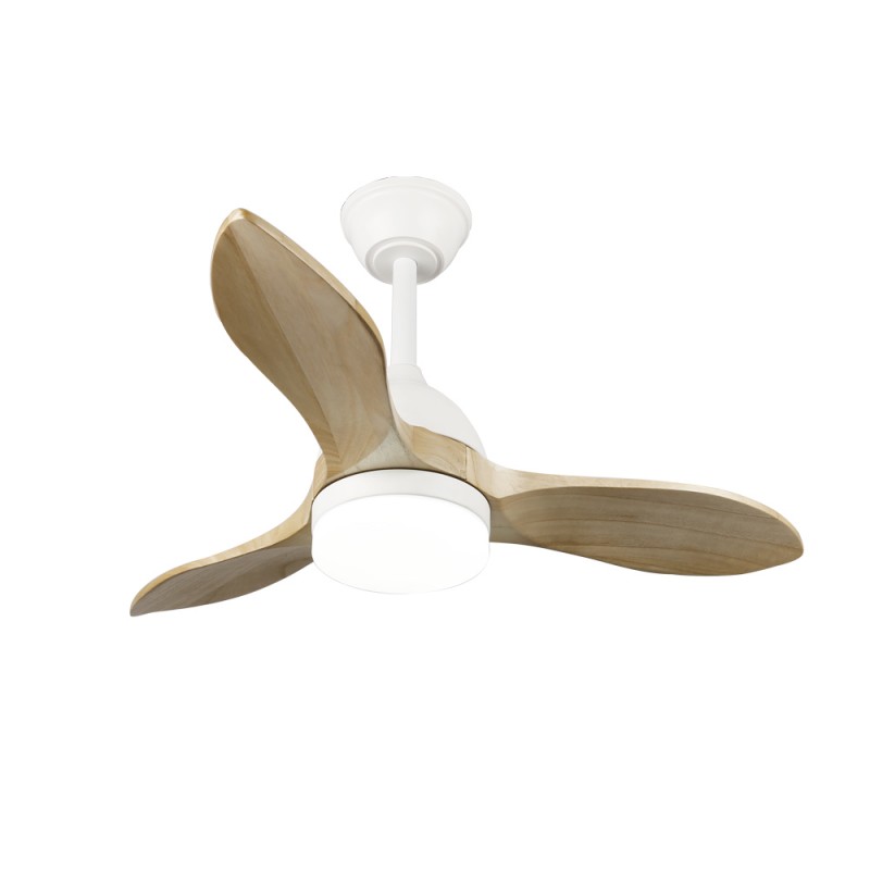 Ceiling fan with natural wood blades. Small LED lamp fan designed to be placed in rooms <13 m3. The fan offers a Nordic style with a white steel motor, three certified natural wood blades and an opal PMMA diffuser. With the remote control you can adjust the lighting and control the 6 speeds of the fan.