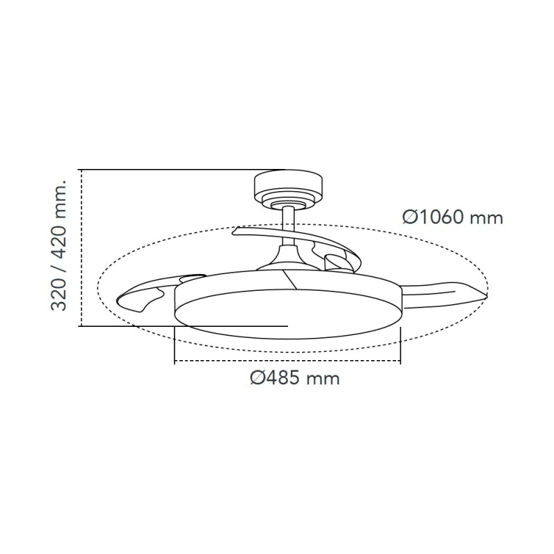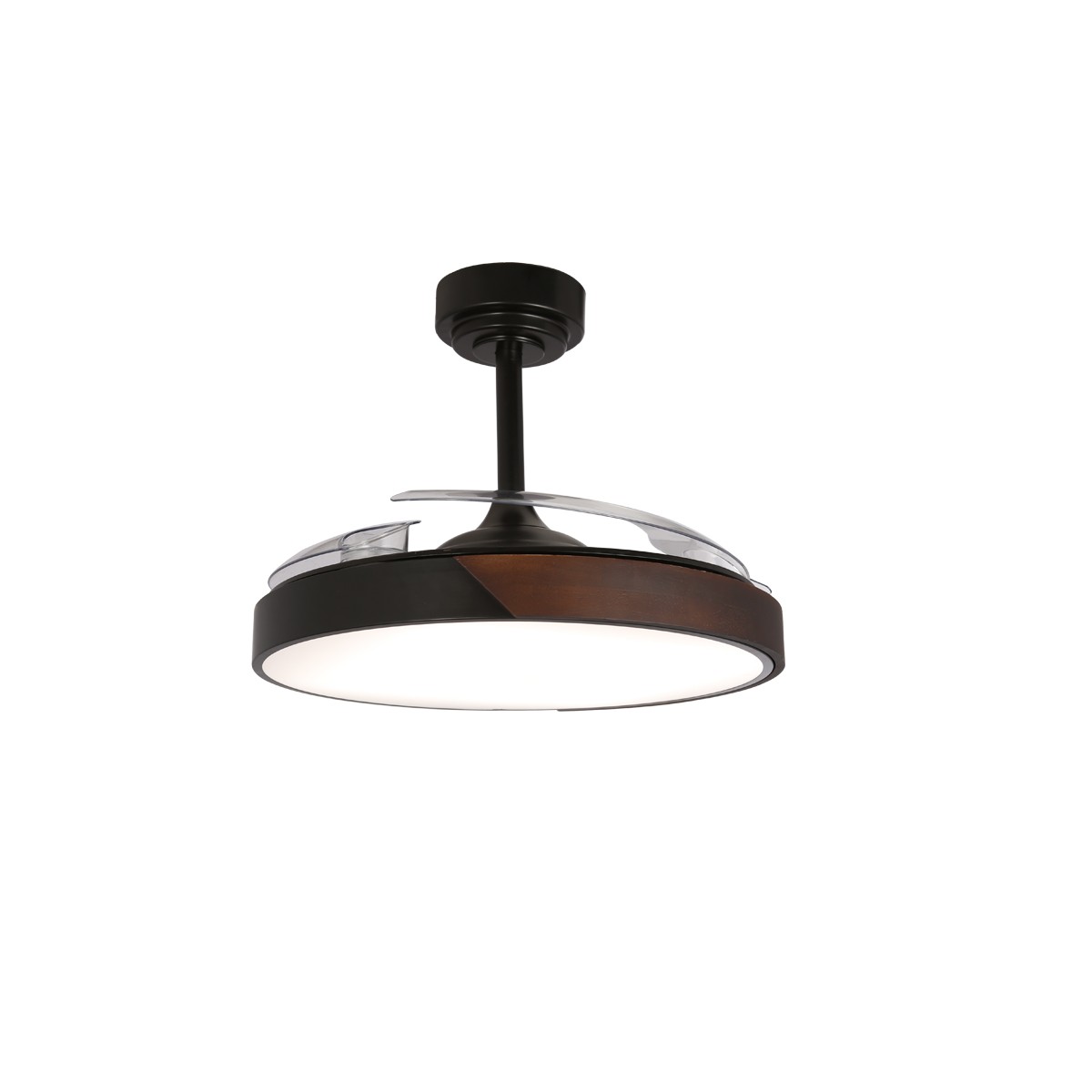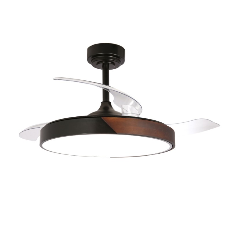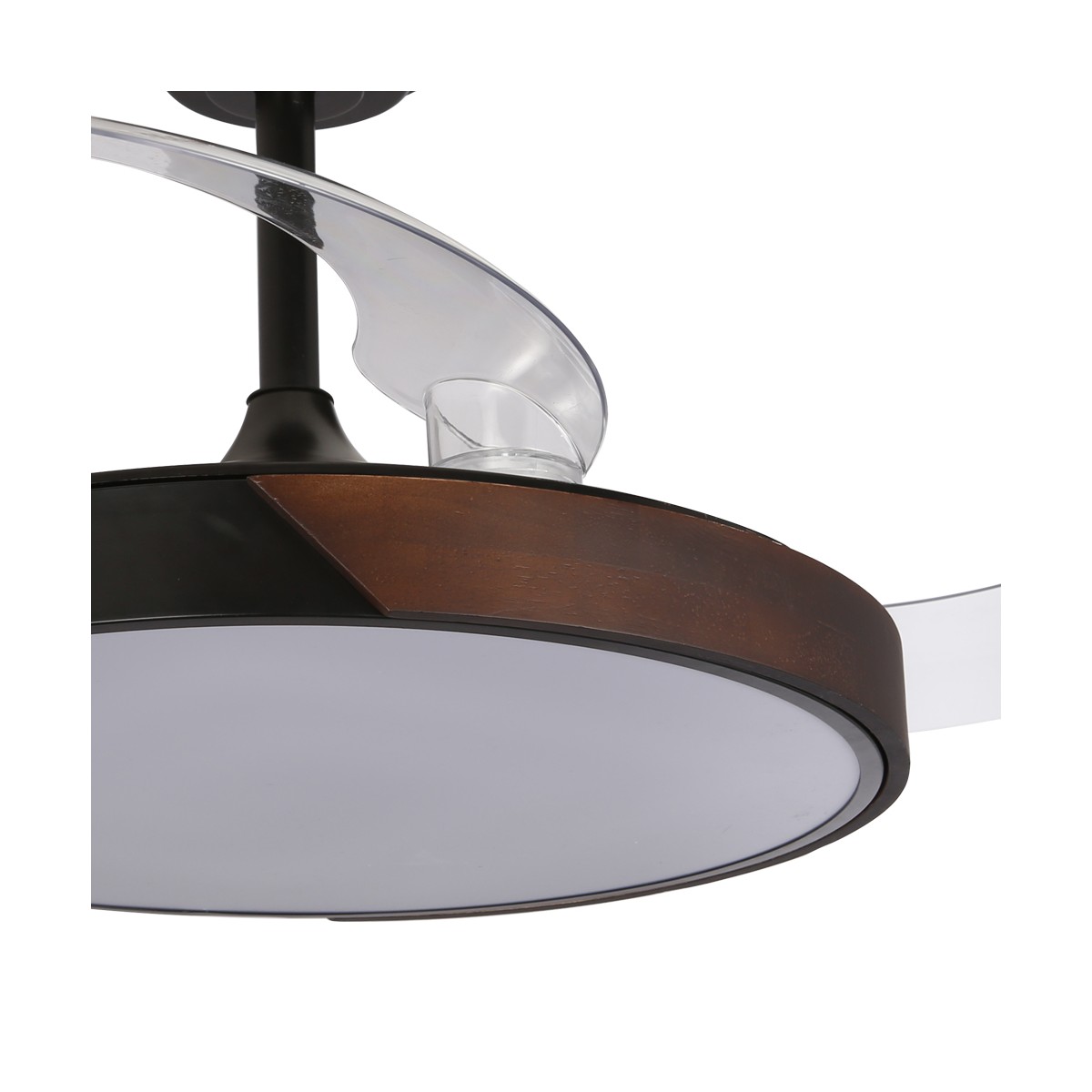 Taoro ceiling fan with retractable blades. Nordic style fan made of black steel and a piece of natural wood for decoration. It provides air flow as well as lighting thanks to its integrated LED technology. The motor is DC with six rotation speeds and emits minimal noise when the fan is running. With the remote control you can adjust the lighting and control the fan. Three colour temperatures, power-on memory, reverse rotation function and timer. Ceiling fan in black colour, wooden part and transparent blades.