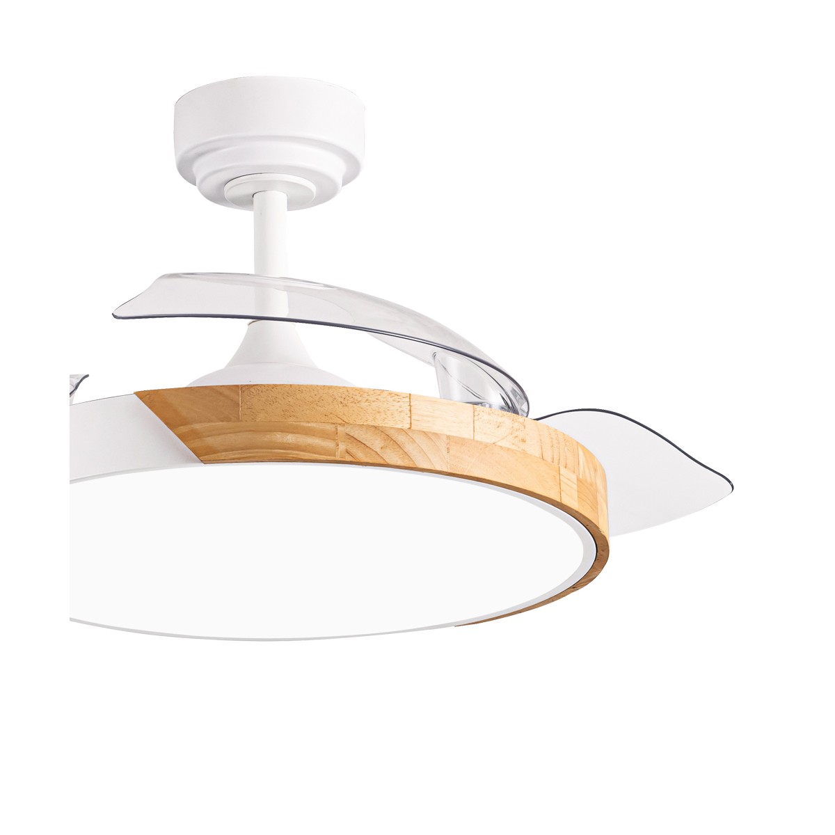 Taoro Mini retractable blades ceiling fan. Nordic style fan made of white steel and a piece of natural wood as decoration. Perfect for a small room such as a living room or bedroom. It provides airflow and lighting, both of which can be controlled with the remote control. The motor is DC with six rotation speeds and emits minimal noise when the fan is running. With the remote control you can adjust the lighting and control the fan's functionality. Three colour temperatures, power-on memory, reverse rotation function and timer.