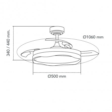 Oko silent ceiling fan. Ceiling fan with retractable blades very practical for living rooms and bedrooms (13-20 m3). It has a silent DC motor with six rotation speeds, reverse function and breeze. It is perfect both for pleasant airflow and for illumination as it also has integrated LED light. Three colour temperatures, dimmable light intensity and power memory. It has retractable blades so that they are retracted over the motor when the fan is not in operation. Remote control included.