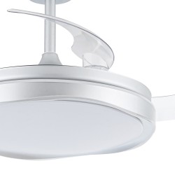 Oko silent ceiling fan. Ceiling fan with retractable blades very practical for living rooms and bedrooms (13-20 m3). It has a silent DC motor with six rotation speeds, reverse function and breeze. It is perfect both for pleasant airflow and for illumination as it also has integrated LED light. Three colour temperatures, dimmable light intensity and power memory. It has retractable blades so that they are retracted over the motor when the fan is not in operation. Remote control included.