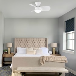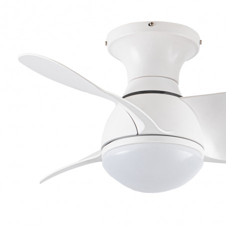 Ceiling fan with LED light for small rooms. Small sized ceiling fan designed for bedrooms and rooms of less than 13 square metres. LED lighting adjustable in intensity and colour temperature. The motor is DC so it emits very little noise and has six rotation speeds. Quiet white fan with three ABS blades.