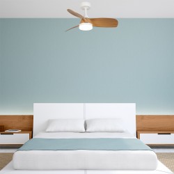 Ventilateur de plafond Byan pour les chambres à coucher et les salles de séjour. Ventilateur silencieux très pratique comme source de lumière et de ventilation dans les chambres à coucher et les pièces de taille moyenne. Moteur à courant continu à six vitesses de rotation, fonction d'inversion et minuterie pour programmer son arrêt. Il dispose d'un éclairage LED intégré réglable en température de couleur et en intensité lumineuse. Couleur blanche avec des lames en ABS effet bois clair.