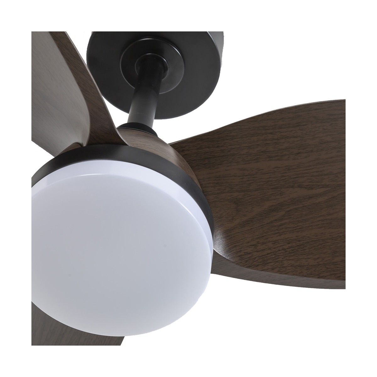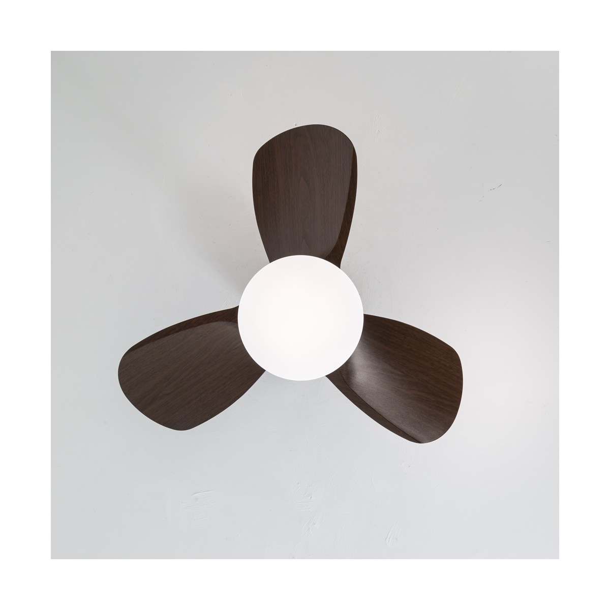 Byan Mini ceiling fan for bedrooms. Small, silent fan, very practical for bedrooms and small rooms. DC motor with six rotation speeds, reverse function and timer to program its switch off. It has integrated LED lighting adjustable in colour temperature and lumen intensity. Black colour with dark wood effect ABS blades.