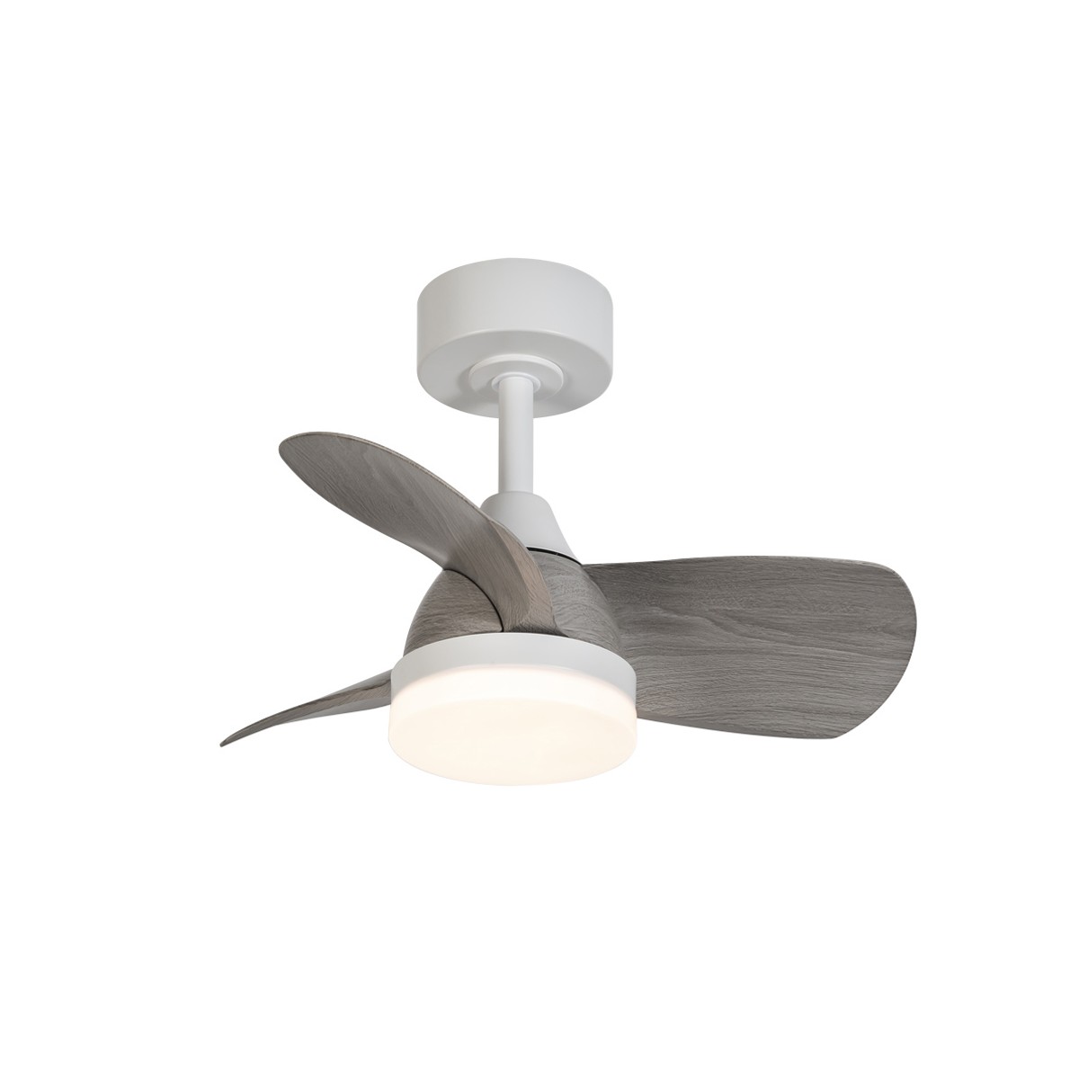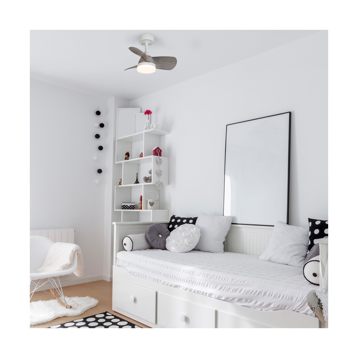 Byan Mini ceiling fan for bedrooms. Small, silent fan, very practical for bedrooms and small rooms. DC motor with six rotation speeds, reverse function and timer to program its switch off. It has integrated LED lighting adjustable in colour temperature and lumen intensity. White colour with ash grey wood effect ABS blades.