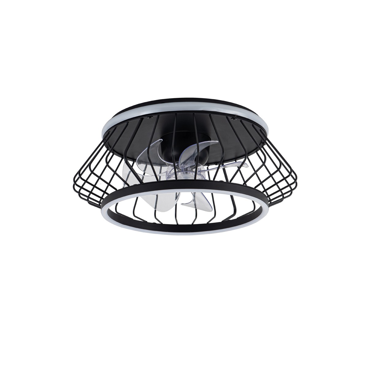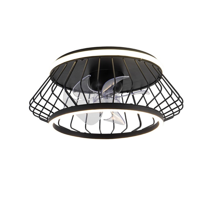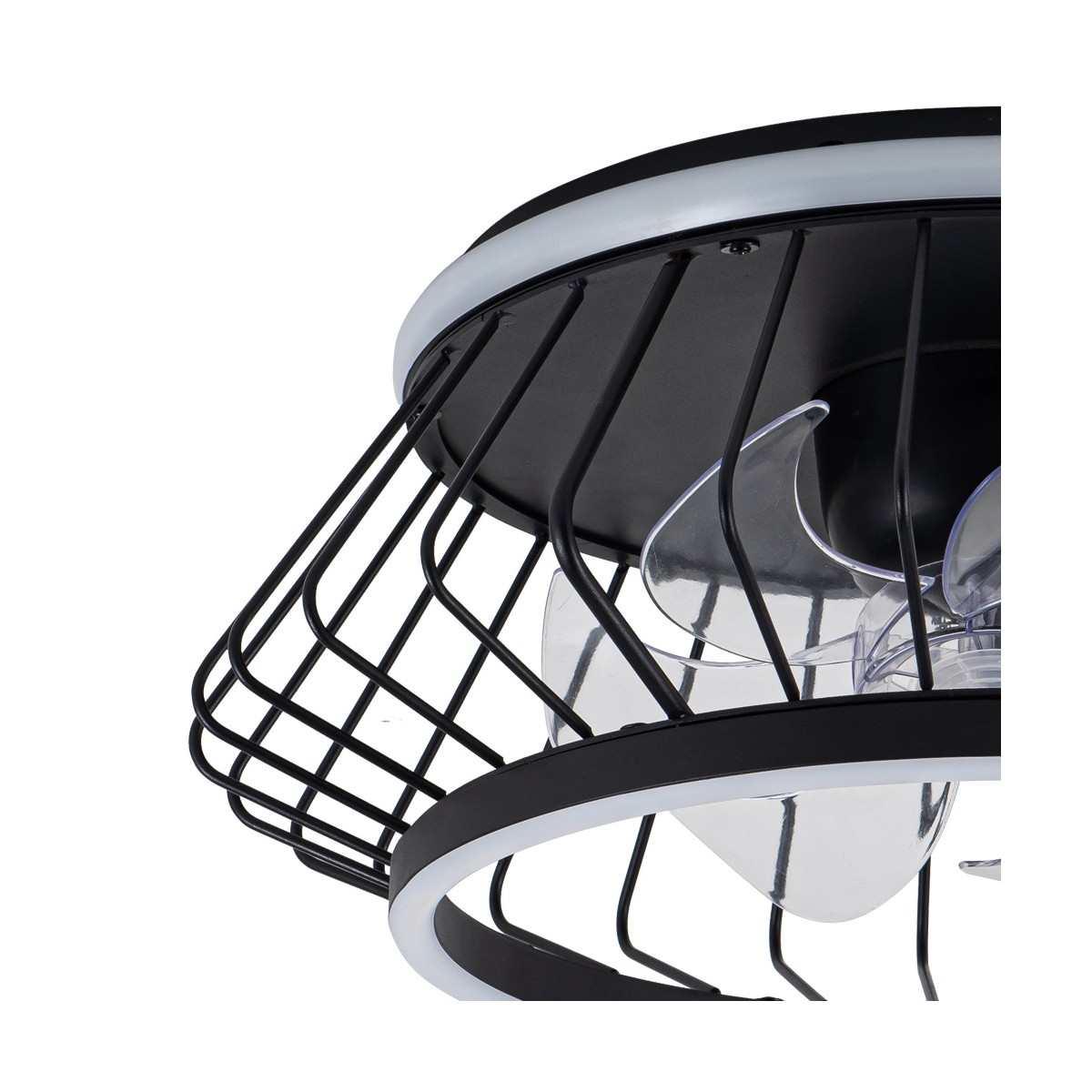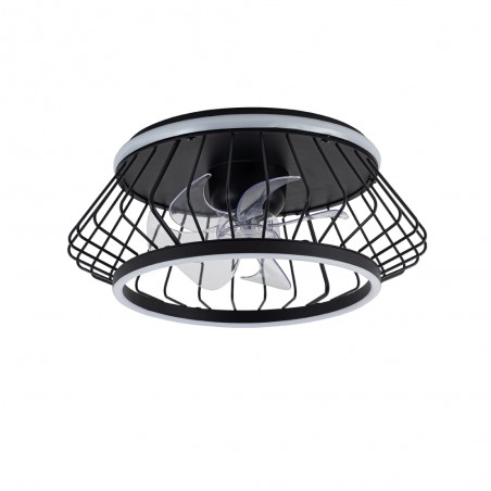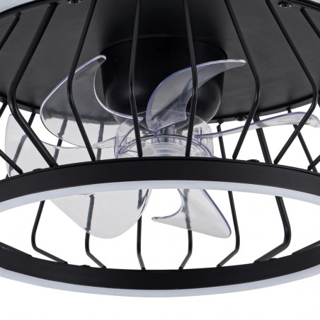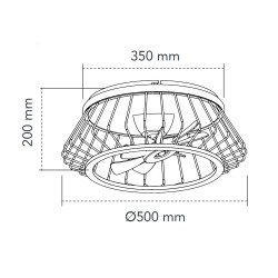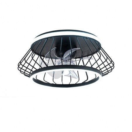 LED ceiling fan for bedrooms and living rooms. Modern design in the shape of an open cage with seven small blades inside. Its motor is very quiet and has six rotation speeds, winter-summer reverse function and timer. Dispersed concentrated airflow, an innovative air circulation system thanks to the directional shaft motors, providing a larger air surface due to its rotation capacity. Fan LED lamp adjustable in intensity and light colour tone.