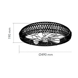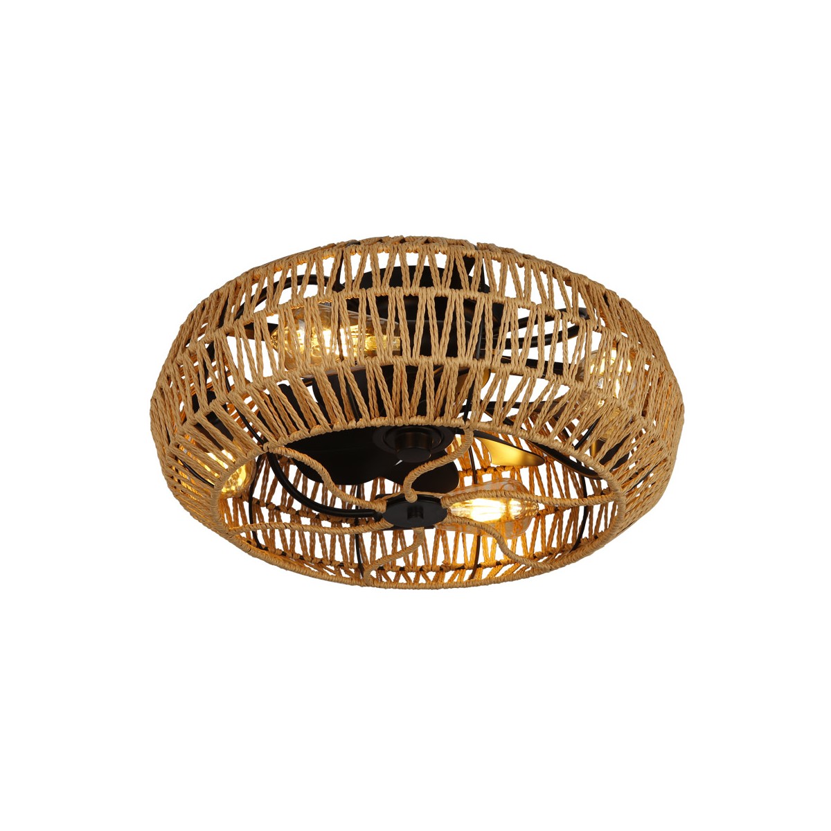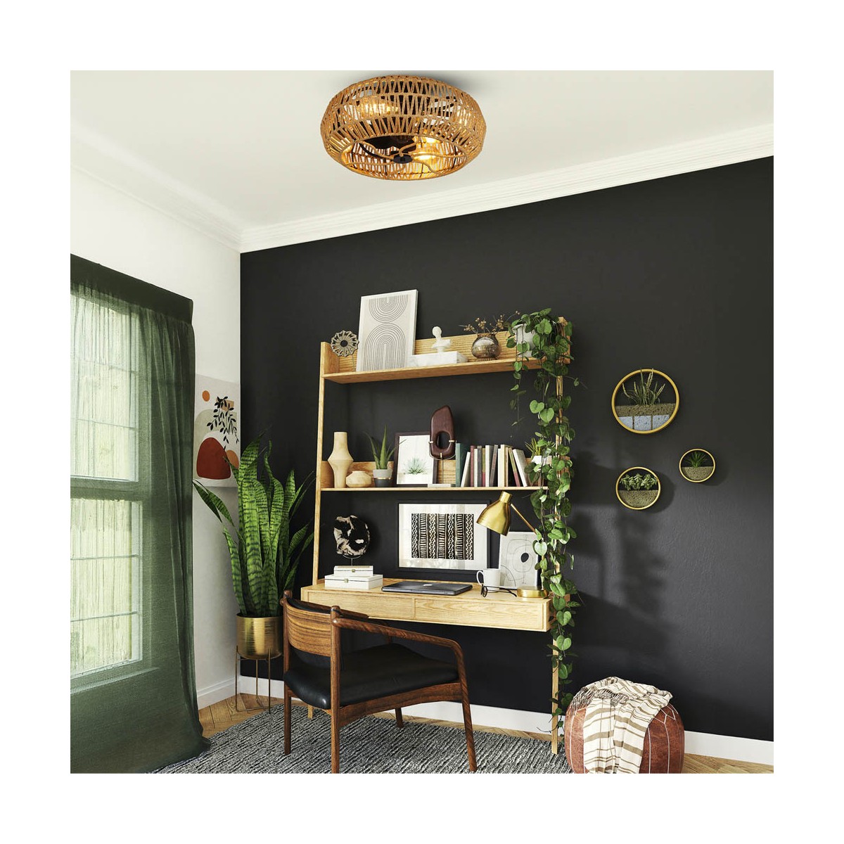 Boho chic ceiling fan for living rooms and bedrooms. Ceiling fan with integrated blades inside a lampshade made of natural fibres. Its design fits perfectly in a boho chic living room or bedroom. It has a silent DC motor with six rotational speeds and is controlled by a remote control (included). Can accommodate four E27 LED bulbs. Easy to mount directly on the ceiling.