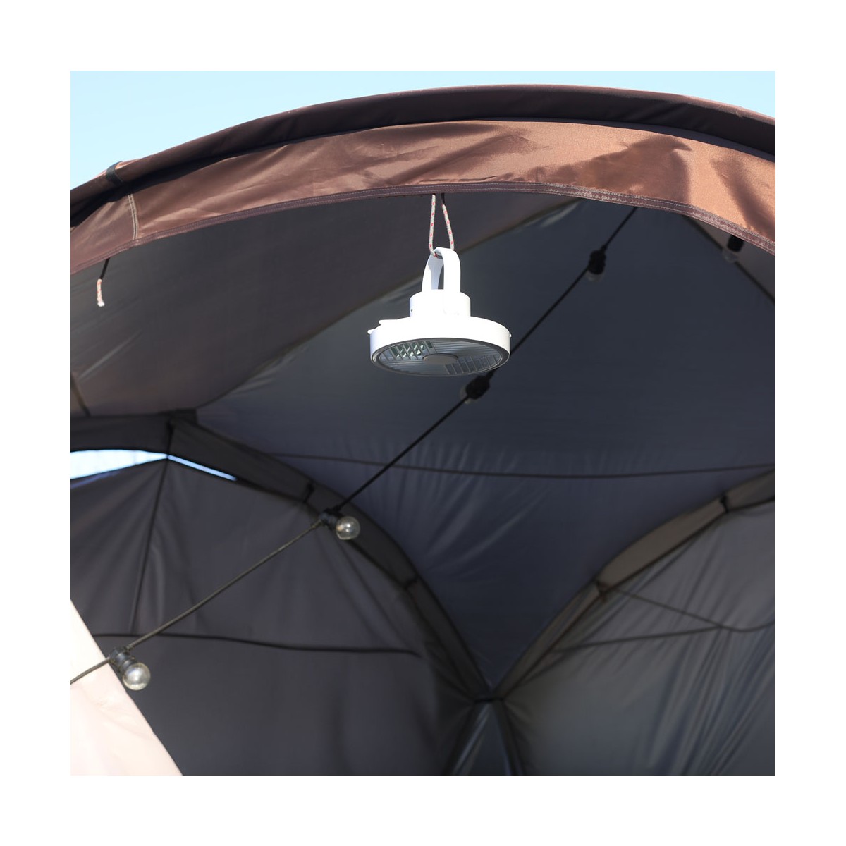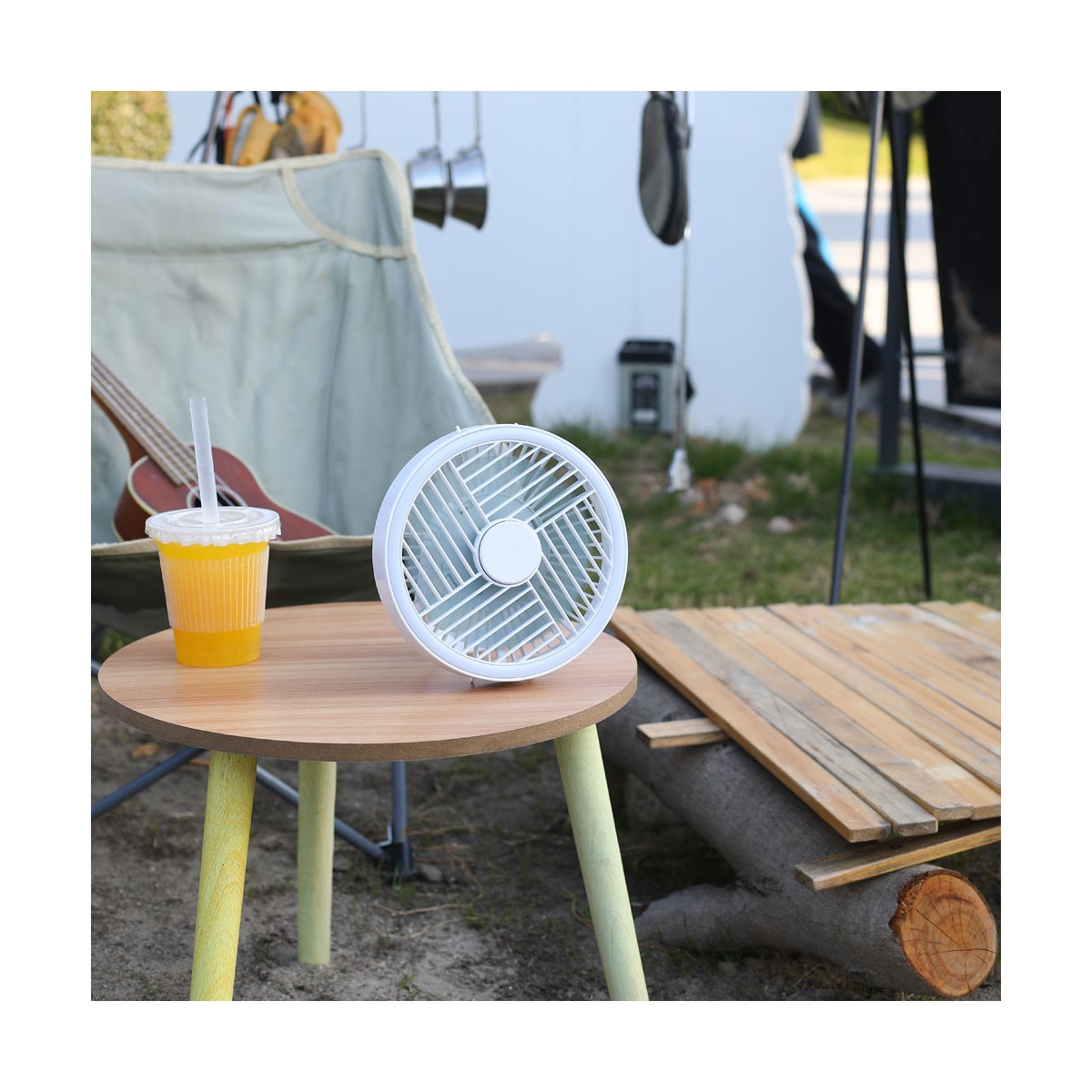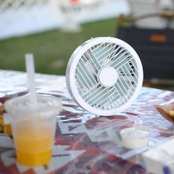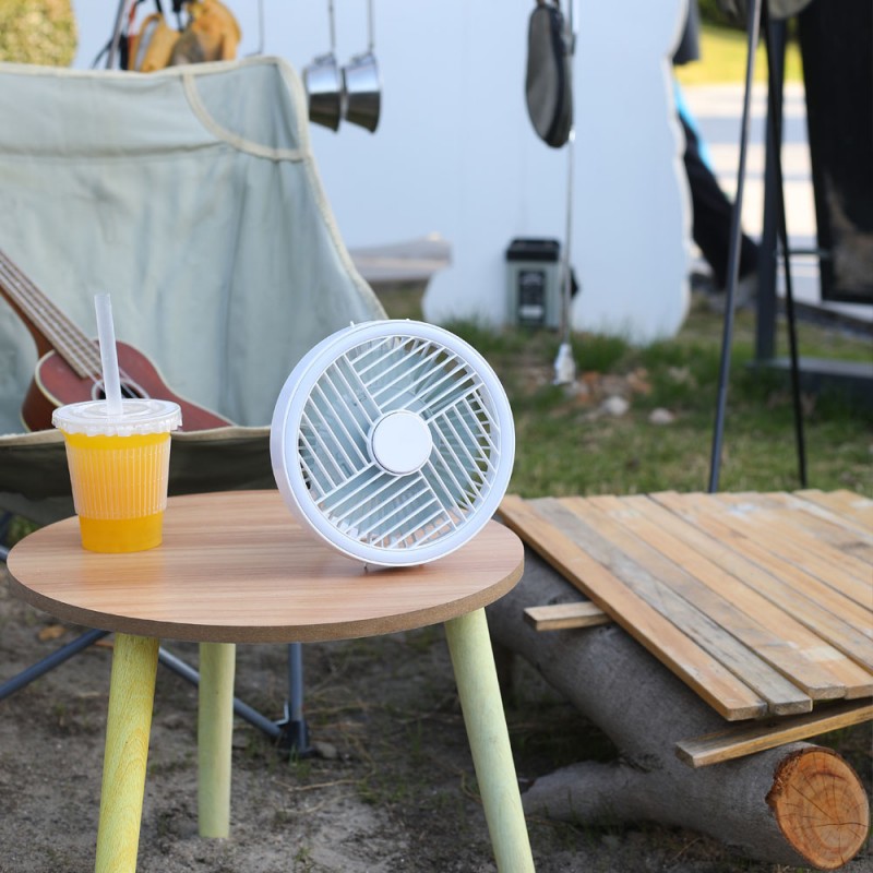 Portable fan with rechargeable battery. Practical fan for use in any room in the house, in the garden or on the terrace. It has a rechargeable battery with USB-C port which allows you to use it without the need for cables. You can place it on a surface such as the table or floor, hang it on the wall or ceiling with a hook. It has two light intensities (50%-100%) and a night light mode.
